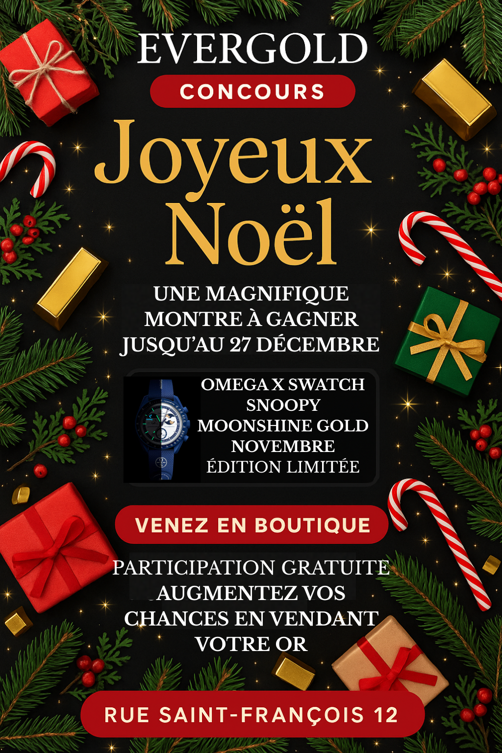 Pour célébrer Noël 2025, Evergold Lausanne organise un concours exceptionnel avec un cadeau introuvable : la toute nouvelle Swatch x Omega MoonSwatch Mission to Earthphase Moonshine Gold (Snoopy), sortie en novembre 2025.