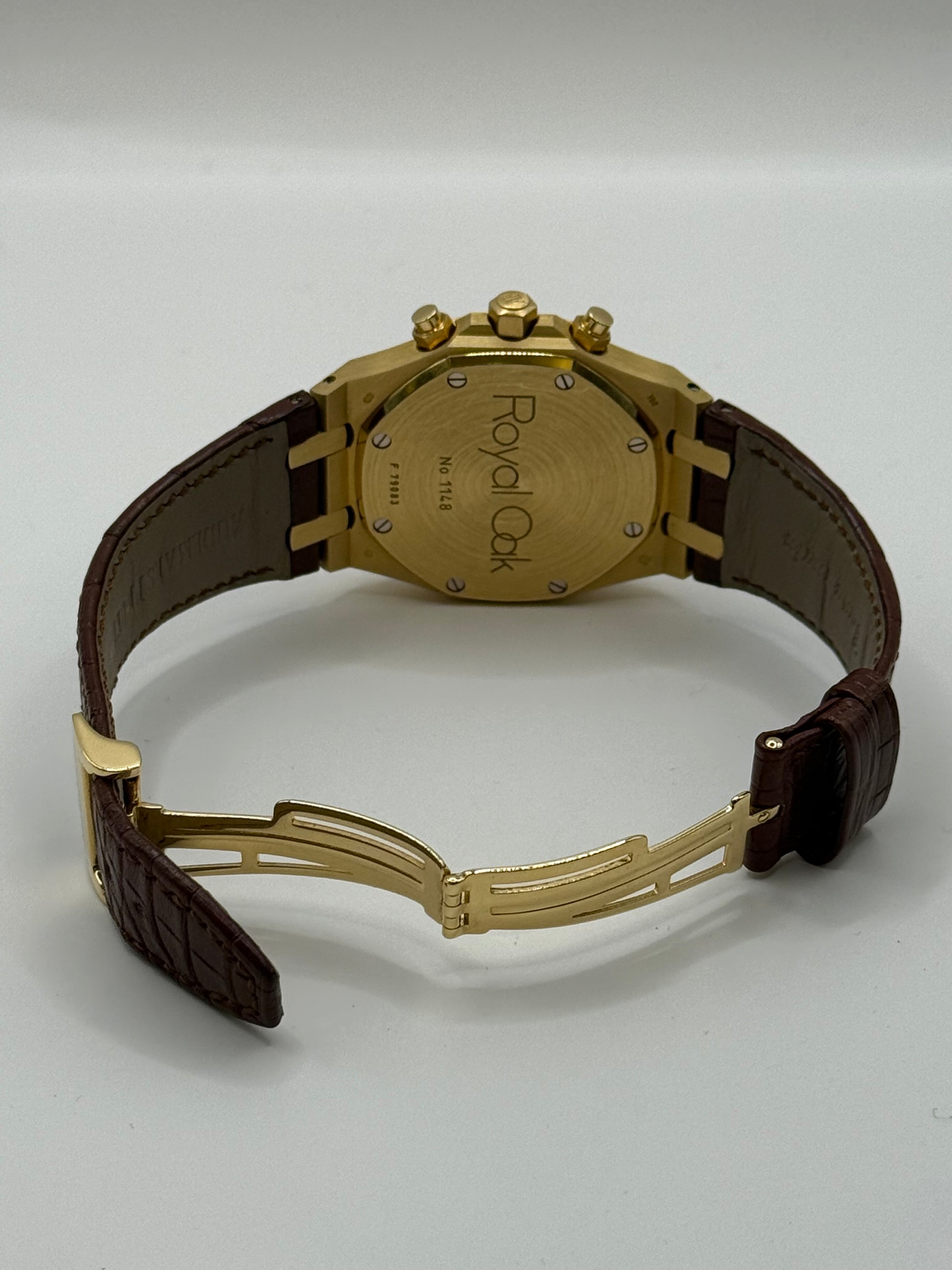 Superbe Audemars Piguet Royal Oak Chronograph en or jaune 18K, référence 26022BA.OO.D088CR.01. Boîtier de 39 mm à la finition satinée, lunette octogonale emblématique fixée par huit vis polies, et cadran crème “Grande Tapisserie” avec trois compteurs ton sur ton et date à 4h30. Mouvement automatique Audemars Piguet calibre 2385, reconnu pour sa précision et sa finesse. Montée sur un élégant bracelet cuir brun avec boucle déployante en or jaune, cette Royal Oak marie parfaitement sportivité et raffinement.