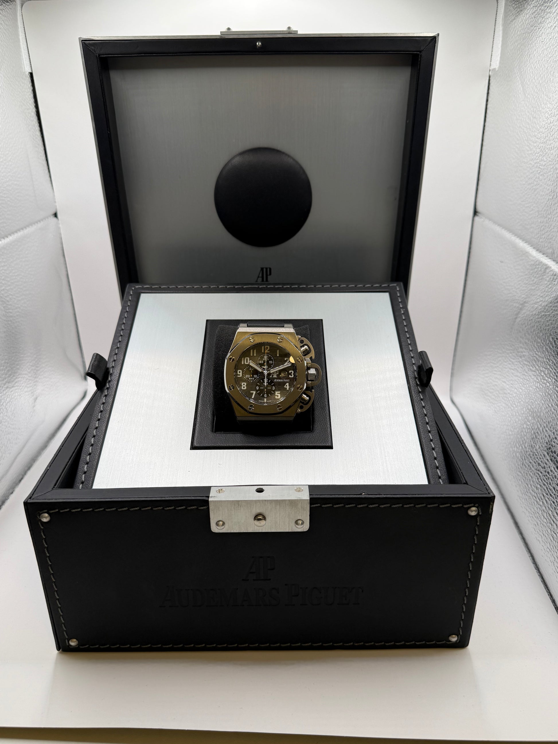 Animée par un mouvement automatique calibre AP 2226/2840, elle propose les fonctions heures, minutes, petite seconde, date et chronographe, avec une réserve de marche d’environ 42 heures. Le bracelet en cuir noir complète l’ensemble avec élégance, tandis que la montre est présentée avec sa boîte Audemars Piguet d’origine, soulignant son statut de pièce de collection.