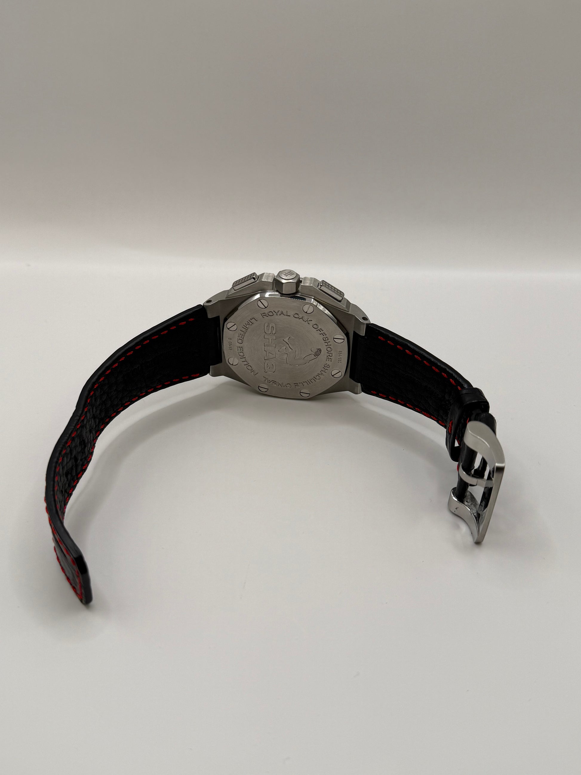 Édition limitée à 960 exemplaires, cette Audemars Piguet Royal Oak Offshore “Shaquille O’Neal” est un modèle iconique de 48 mm, symbole de puissance et de style. Boîtier en acier brossé, lunette octogonale fixée par huit vis polies, cadran noir “Méga Tapisserie” avec chiffres arabes gris et rouges, où le 2 et le 3 rouges rendent hommage au numéro de maillot de Shaq. Mouvement automatique Audemars Piguet calibre 3126/3840 avec fonction chronographe et date. Montée sur un bracelet cuir noir avec surpiqûres rouges, elle allie performance et présence spectaculaire.