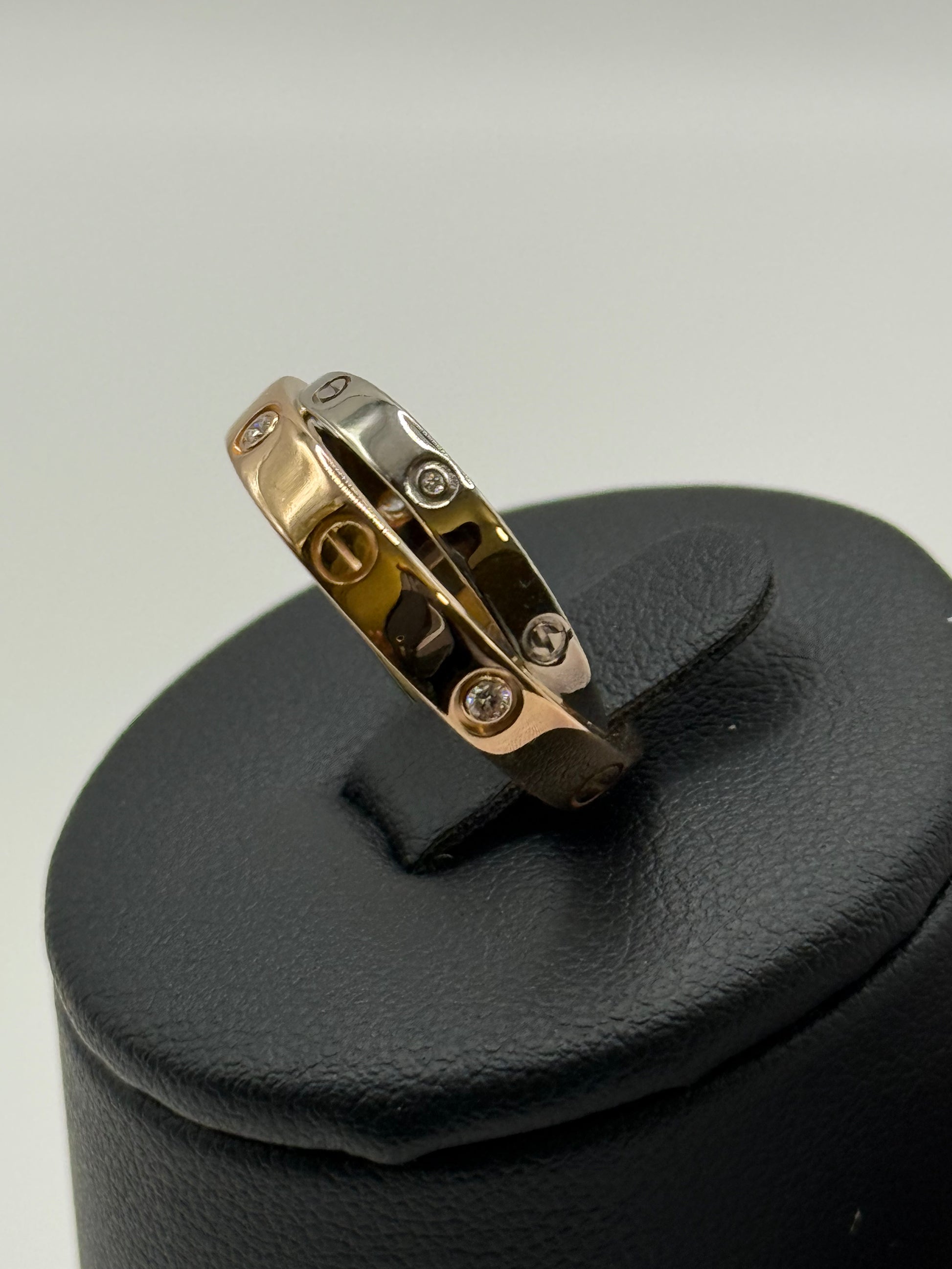 Cette pièce rare et élégante de la collection Love de Cartier présente un design entrelacé composé de deux anneaux qui se rejoignent en un seul mouvement fluide. Le premier anneau, en or rose 18 K, reprend le motif iconique des vis Love, symbole d’attachement et de design intemporel. Le second anneau, en or blanc 18 K, est illuminé par des diamants brillants, soigneusement sertis pour offrir un éclat raffiné à chaque mouvement de la main.