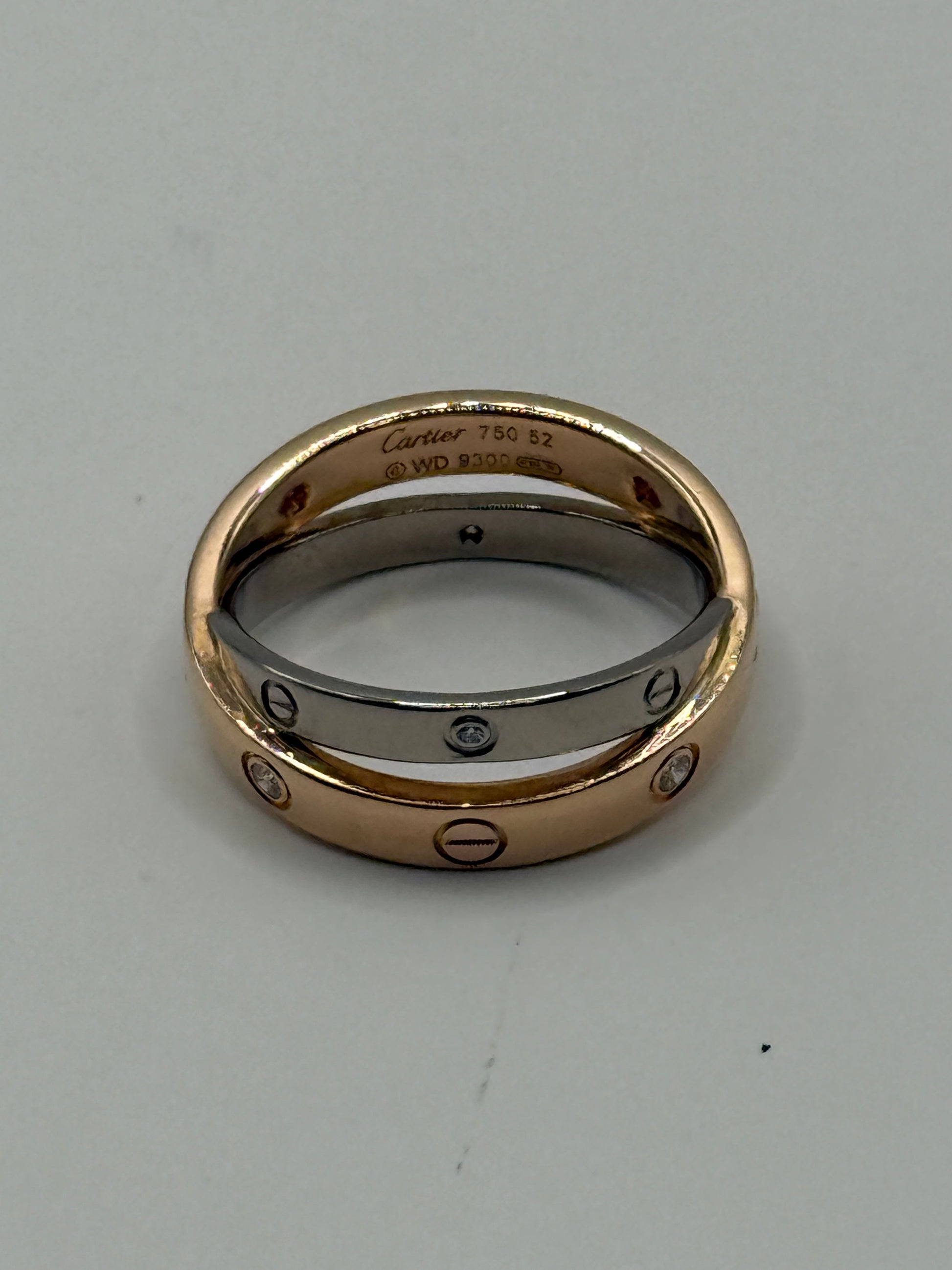 L’ensemble crée un contraste harmonieux entre la chaleur de l’or rose et la pureté de l’or blanc, renforcé par la brillance des diamants. Cette double structure, à la fois moderne et symbolique, reflète parfaitement le savoir-faire joaillier de Cartier.