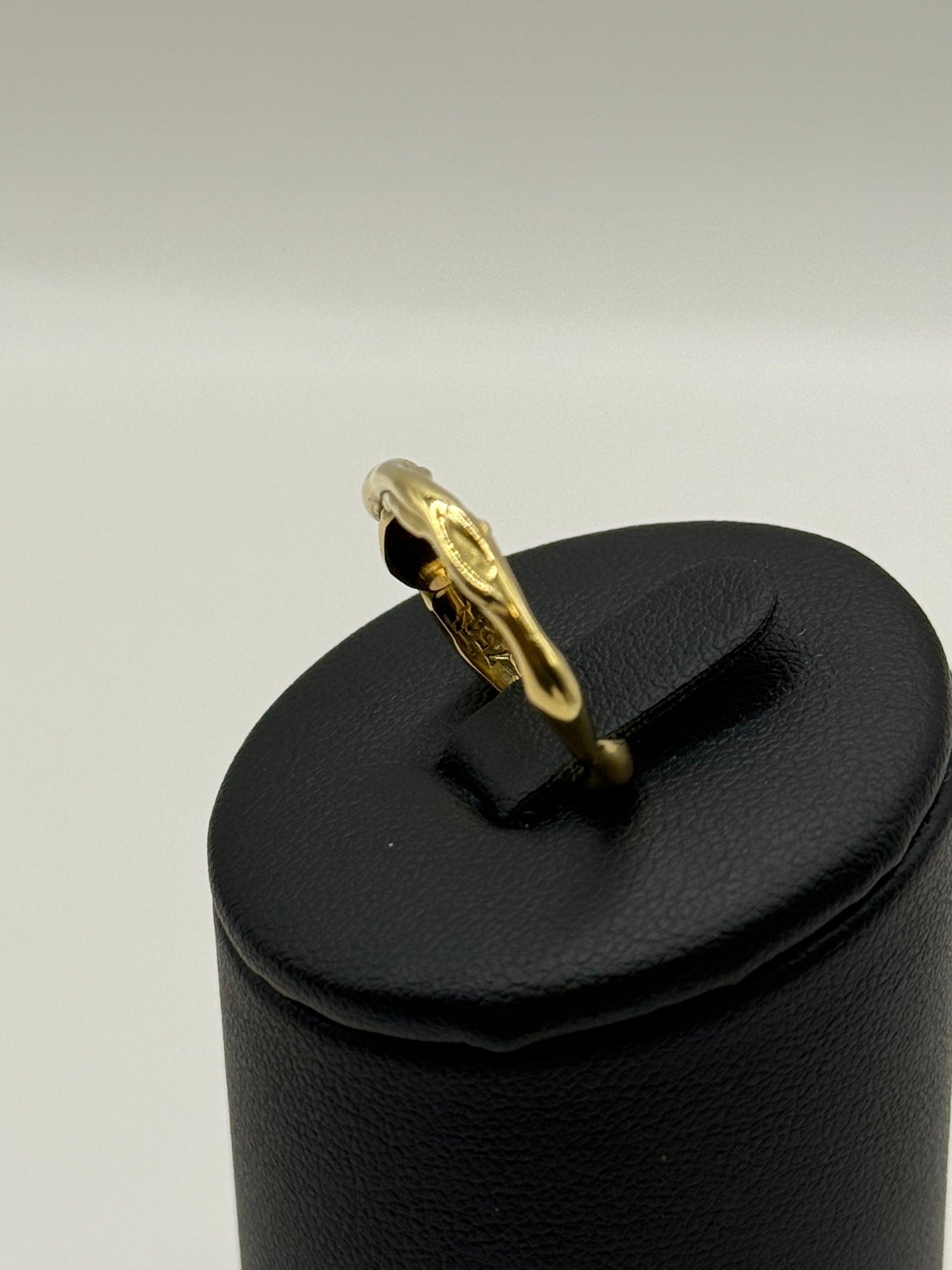 Cette bague en or 750 (18 K) présente un design sculptural très inspiré, typique des créations de joailliers contemporains. La monture adopte une forme irrégulière et fluide, presque organique, comme façonnée à la main pour suivre naturellement la courbe du doigt. Cet effet volontairement asymétrique apporte un caractère unique à la pièce, loin des lignes classiques et parfaitement lisses.