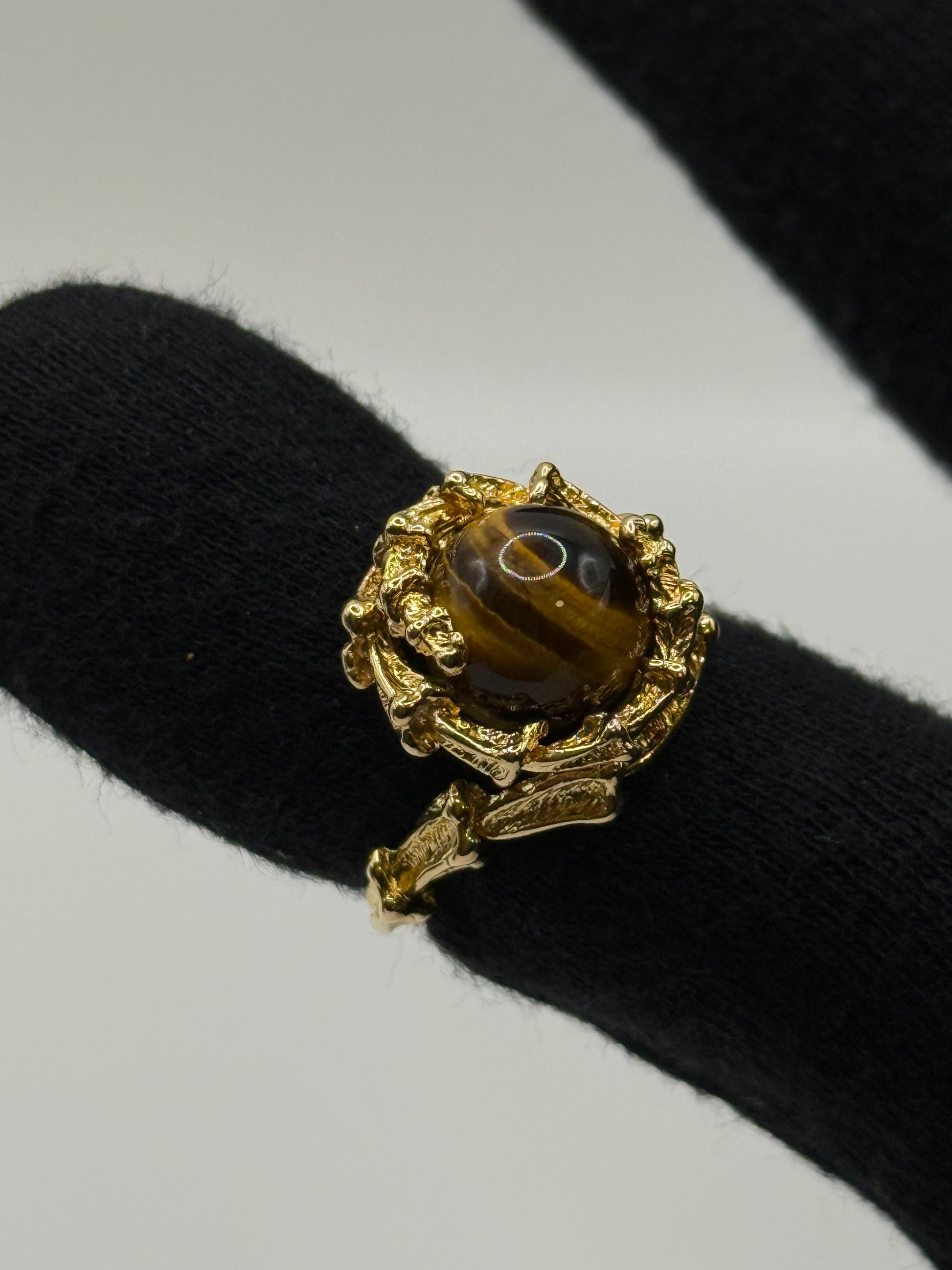 Bague sculpturale signée Gilbert Albert, réalisée en or jaune 18 carats, au design organique immédiatement reconnaissable. Le chaton ajouré, travaillé comme une structure presque architecturale, met en valeur un cabochon d’œil de tigre aux reflets chatoyants brun et doré, dont la profondeur capte la lumière à chaque mouvement. L’anneau présente un travail de matière volontairement texturé, signature emblématique du style audacieux et avant-gardiste de Gilbert Albert. Cette pièce au caractère affirmé est proposée en taille 49, avec mise à taille possible sur demande. Venez l’essayer dans le magasin Evergold à la rue Saint-François 12 à Lausanne.