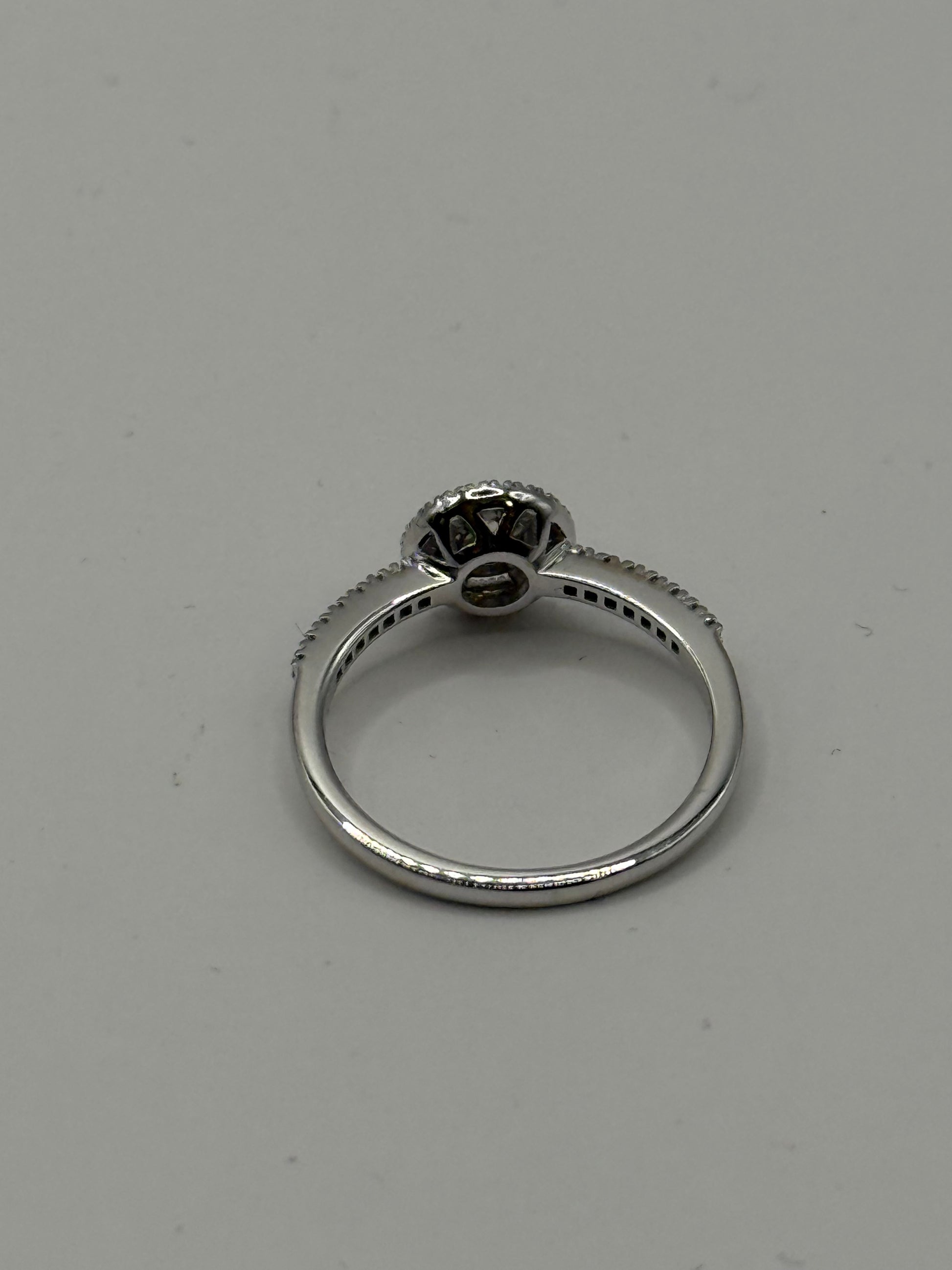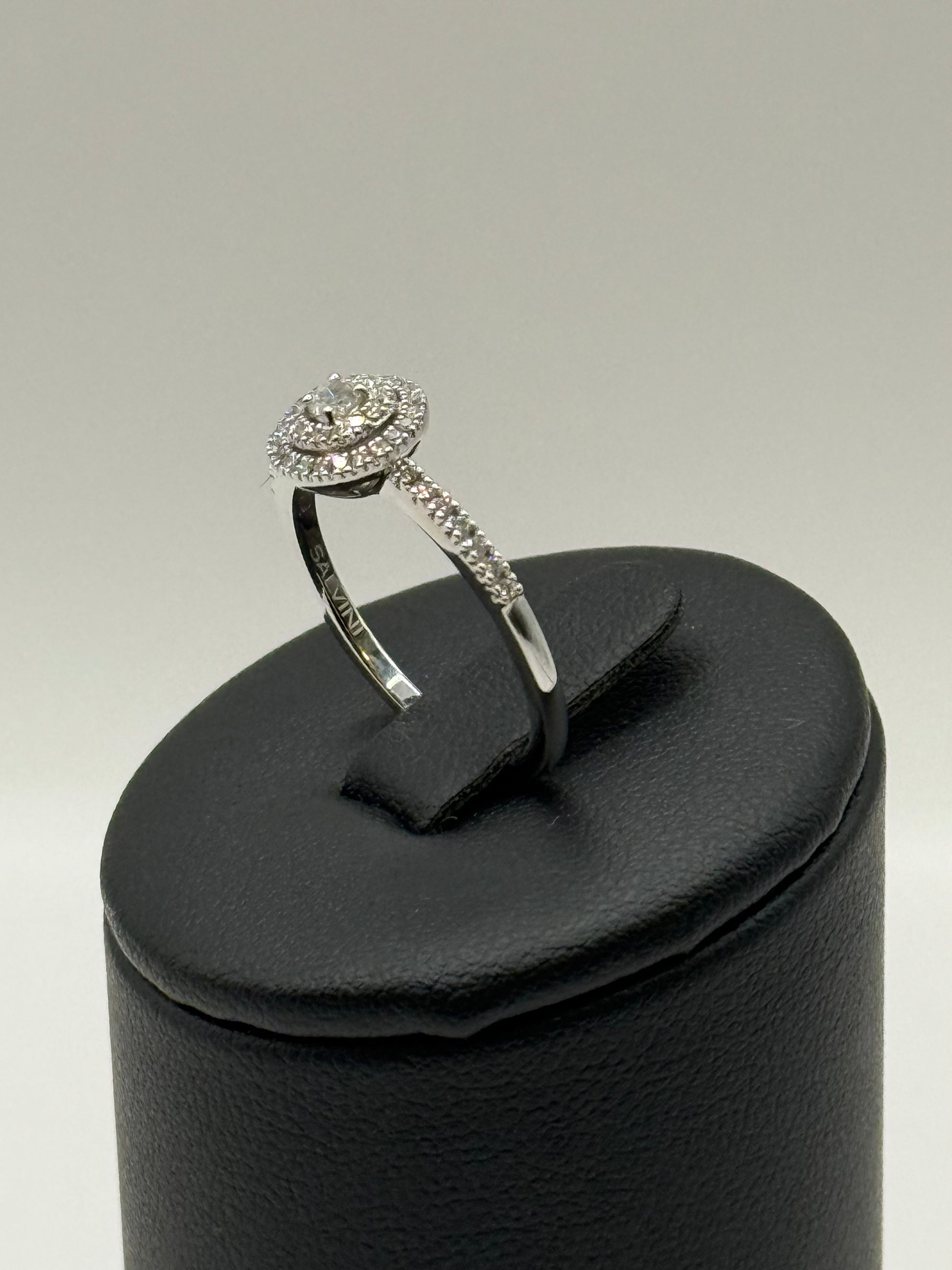 Cette bague en or blanc se distingue par un diamant central magnifié par un double halo de diamants, créant un éclat intense et harmonieux. La monture, finement ajourée sous la pierre, permet une circulation optimale de la lumière, révélant toute la brillance du serti. Les épaules pavées prolongent cette luminosité avec délicatesse, apportant une touche raffinée et féminine à l’ensemble. Une pièce élégante et intemporelle, pensée pour sublimer chaque moment.