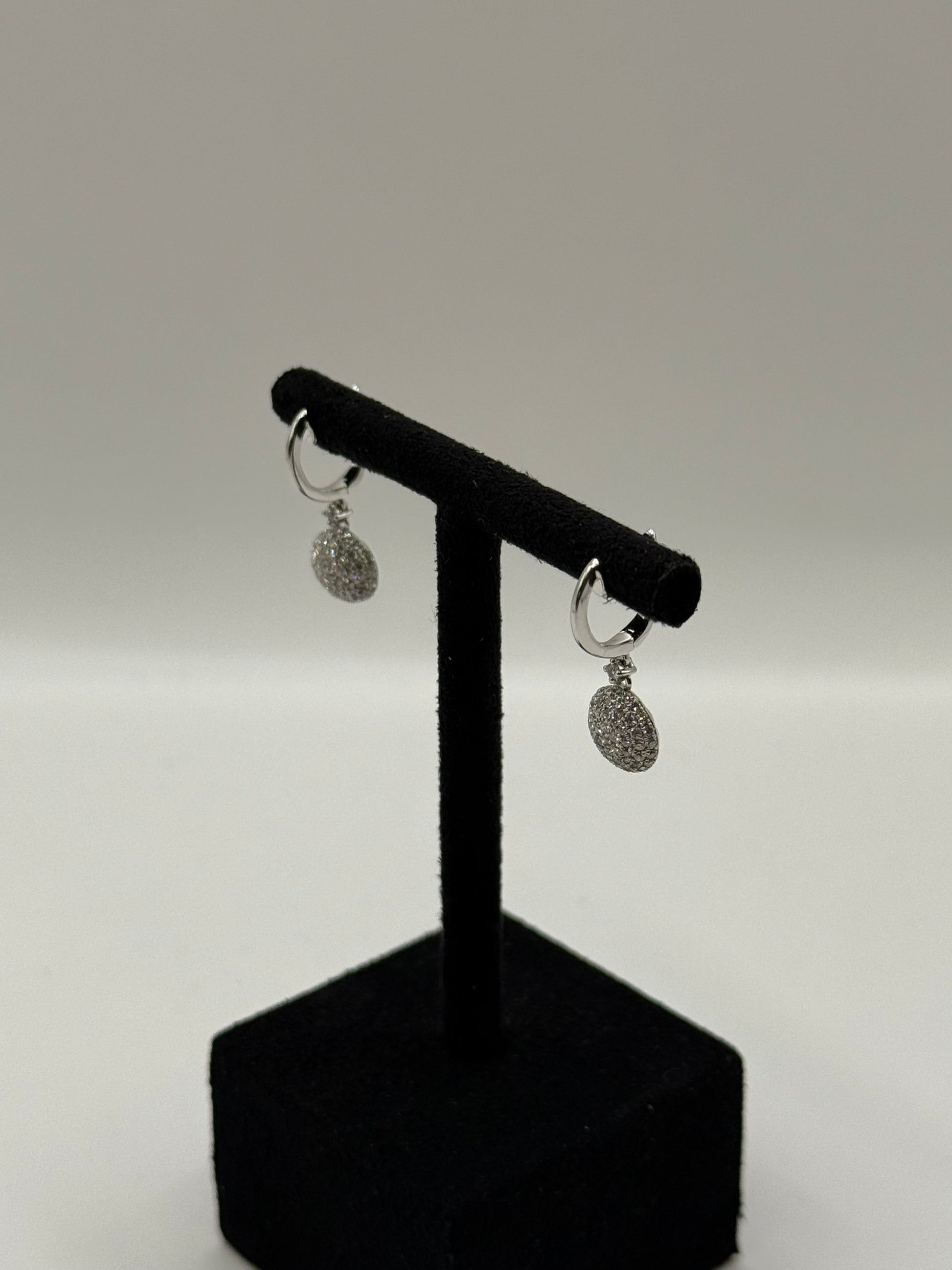 Ces boucles d’oreilles présentent un pendentif circulaire entièrement pavé de diamants, offrant un éclat fin et homogène. Le motif en forme de dôme met en valeur la brillance des pierres, tandis que les anneaux en or blanc apportent une touche contemporaine et raffinée. Le design, délicat mais lumineux, en fait une pièce élégante adaptée aussi bien au quotidien qu’aux occasions spéciales.
