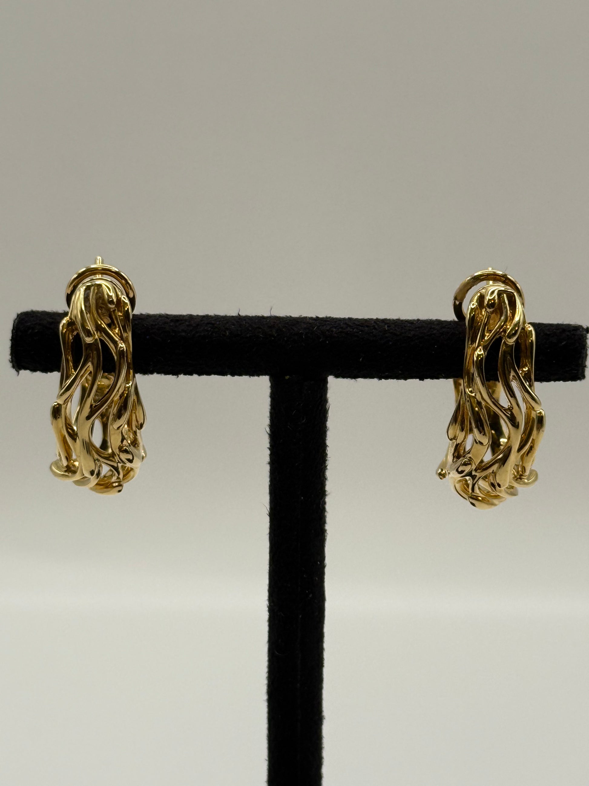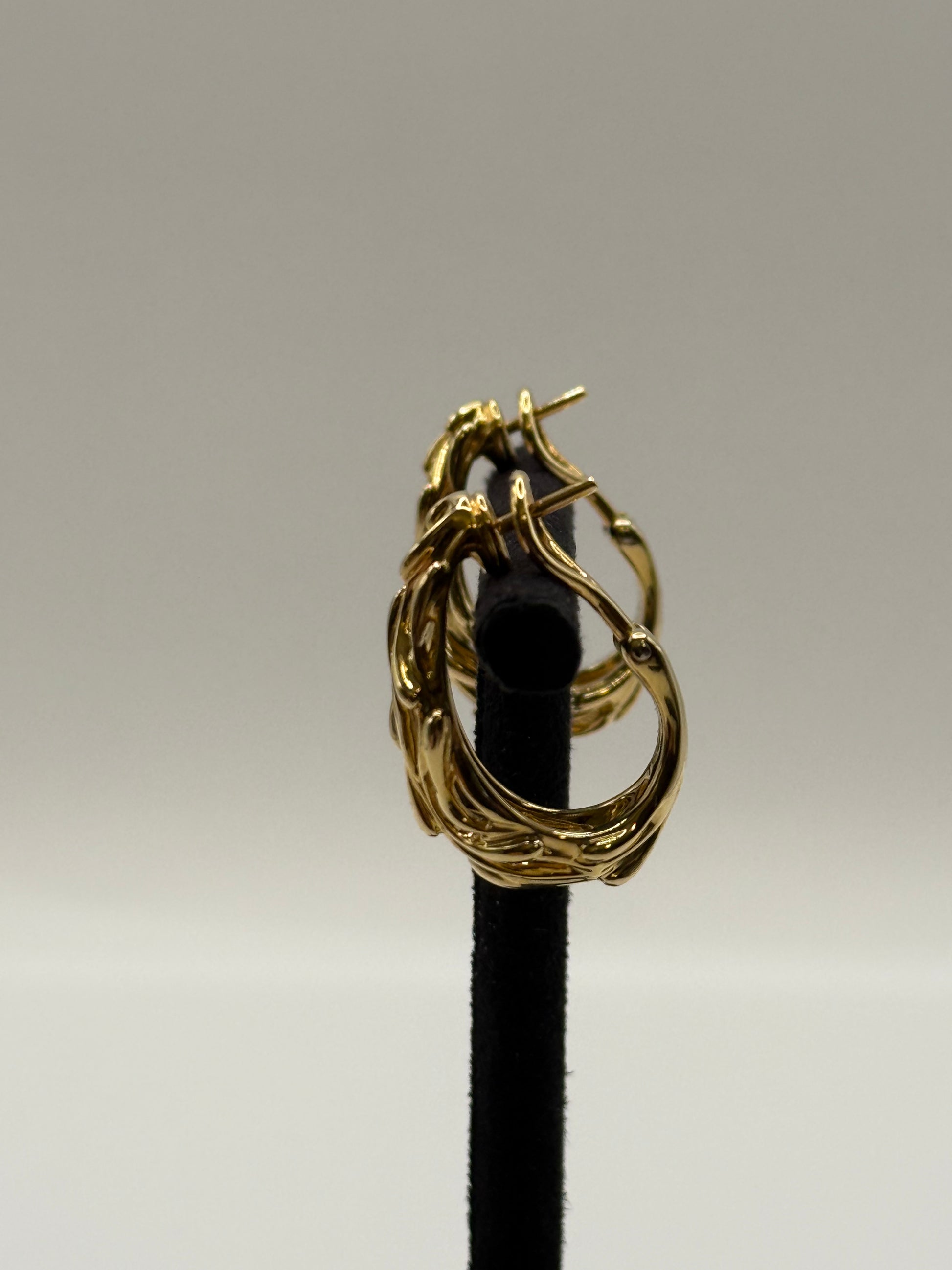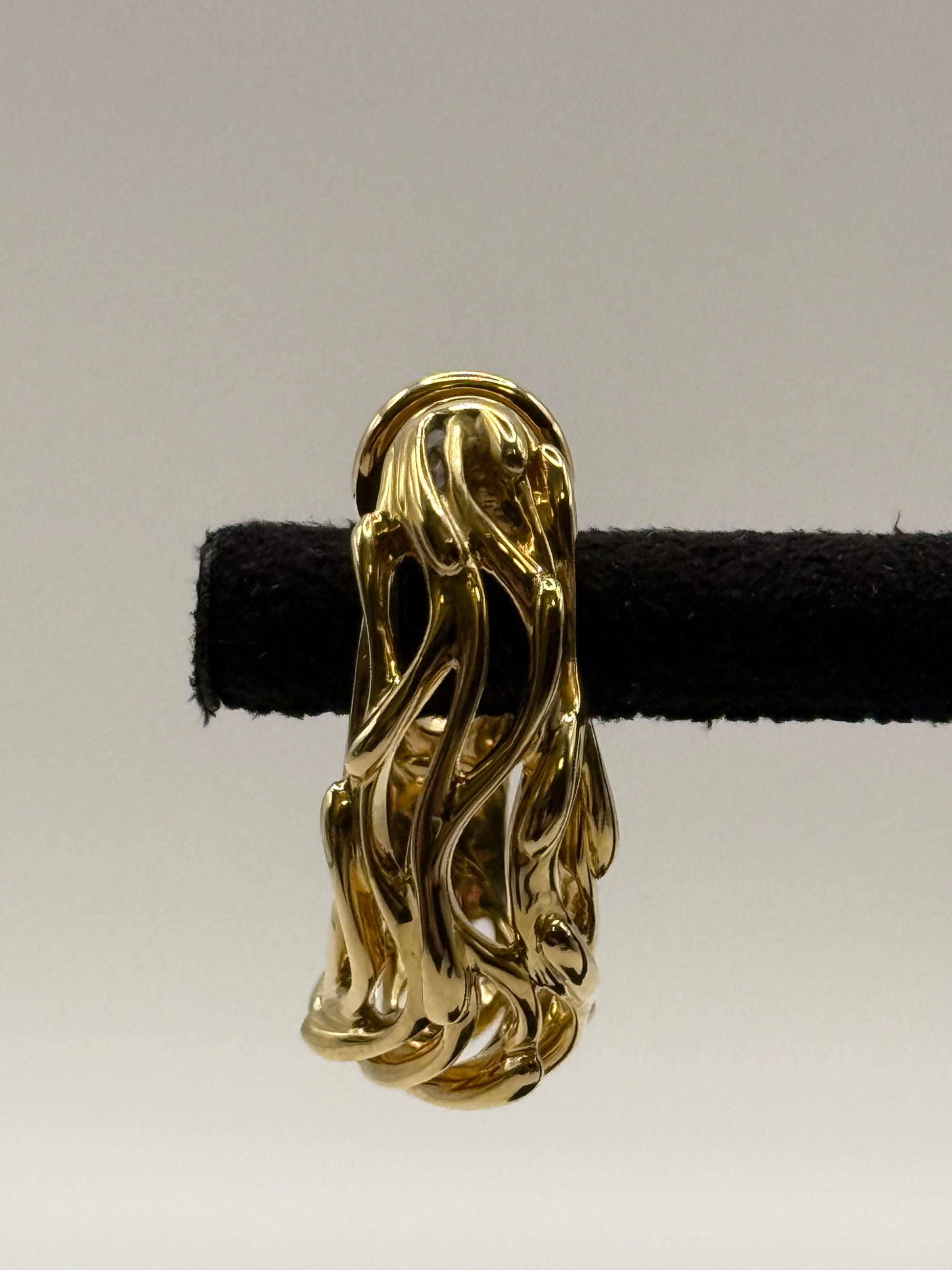 Ces boucles d’oreilles en or jaune se distinguent par leurs lignes fluides et entrelacées, rappelant un mouvement naturel et élégant. Leur forme sculpturale capte magnifiquement la lumière, apportant une touche de chaleur et de raffinement. Une pièce moderne et expressive, idéale pour affirmer un style à la fois chic et original.