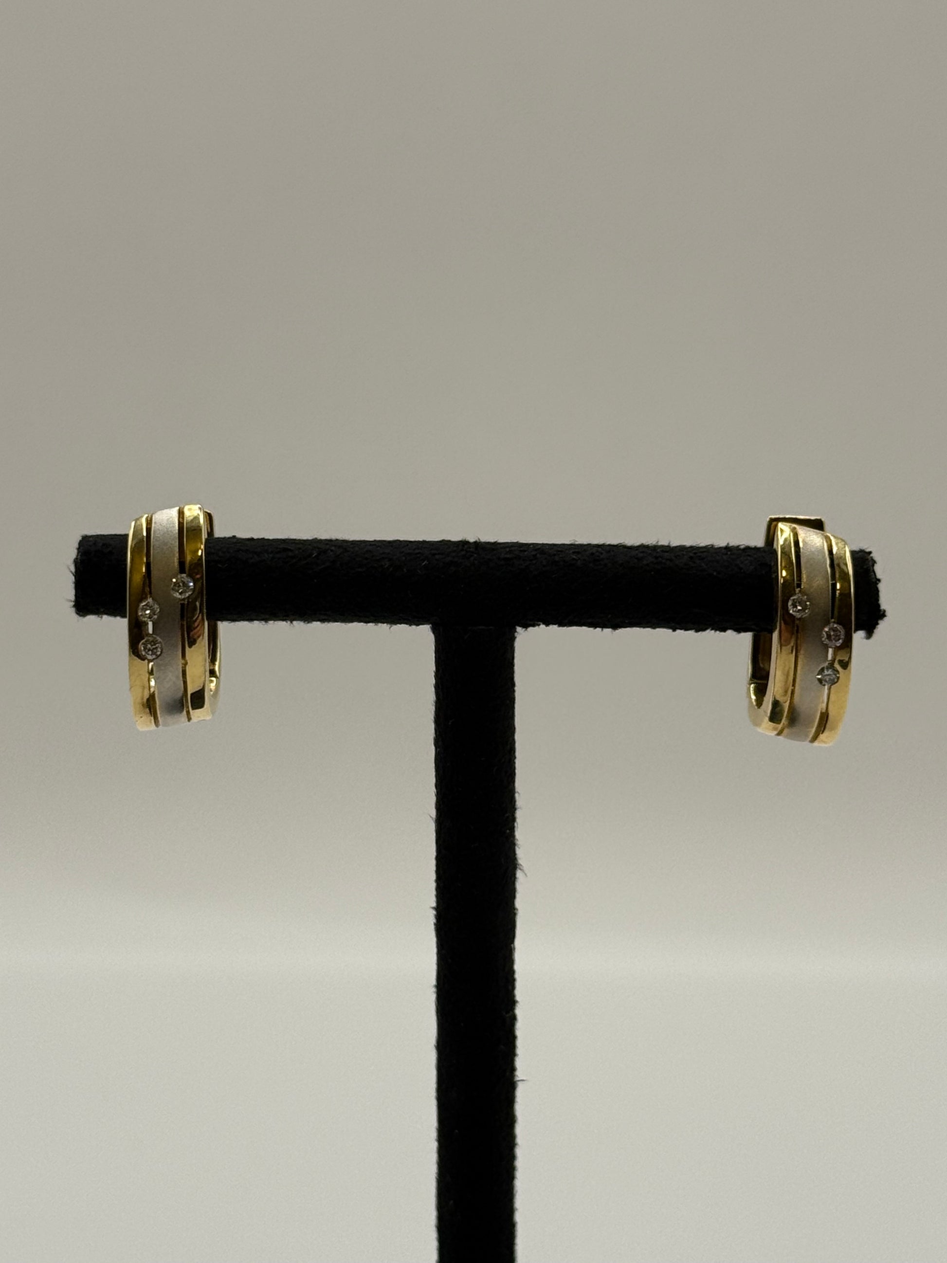 Ces boucles d’oreilles allient la chaleur de l’or jaune à l’éclat raffiné de l’or blanc, sublimées par de petits diamants délicatement sertis. Leur design à bandes croisées crée un jeu de contrastes élégant et lumineux. Un modèle à la fois classique et contemporain, parfait pour apporter une touche de sophistication discrète à chaque tenue.