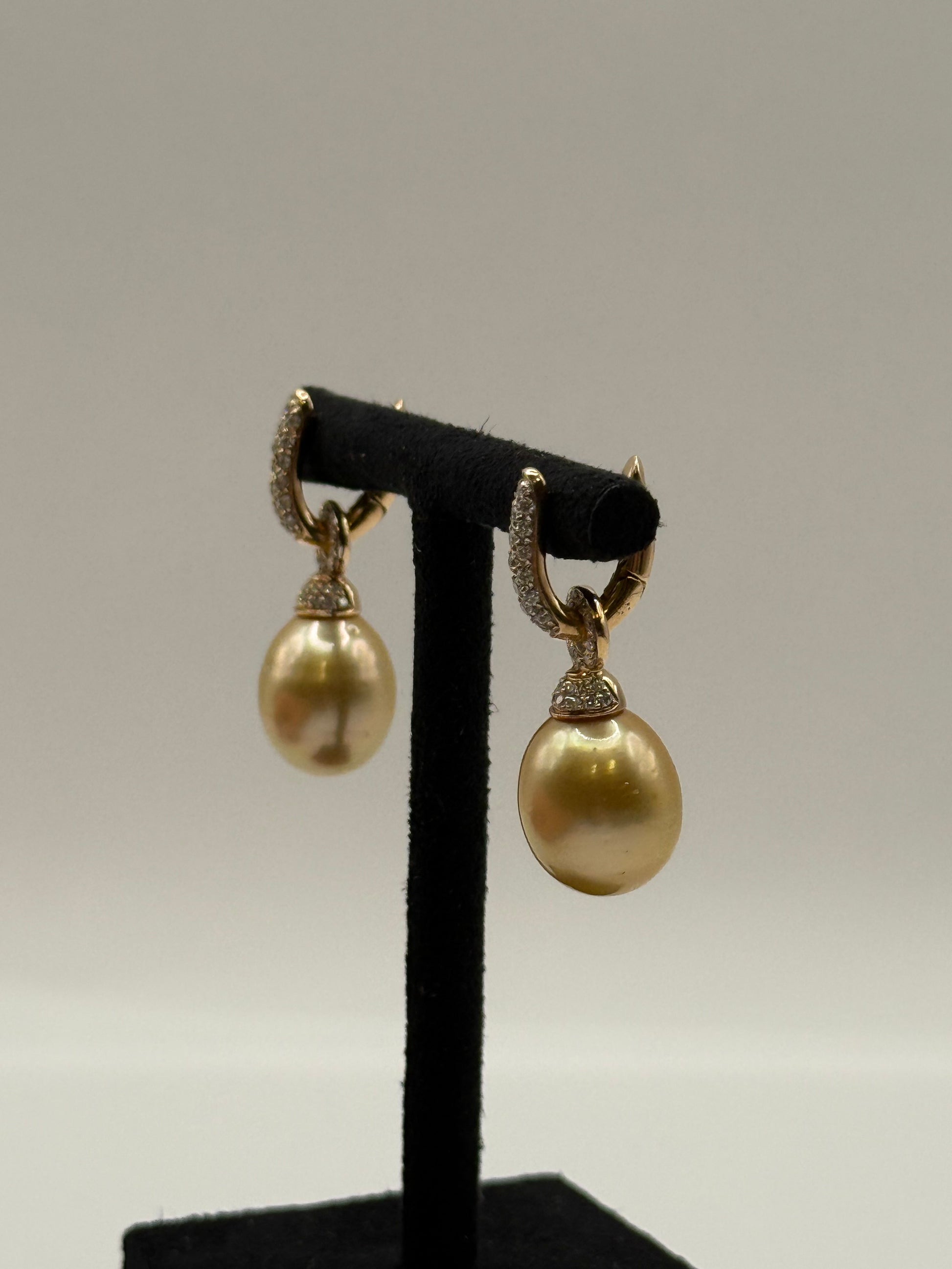 Ces boucles d’oreilles en or jaune associent la brillance des diamants à l’éclat somptueux de perles dorées au lustre soyeux, probablement des perles des mers du Sud. Très rares et recherchées, ces perles se distinguent par leur teinte naturellement dorée et leur éclat profond. Un bijou d’exception qui allie raffinement, rareté et élégance intemporelle.