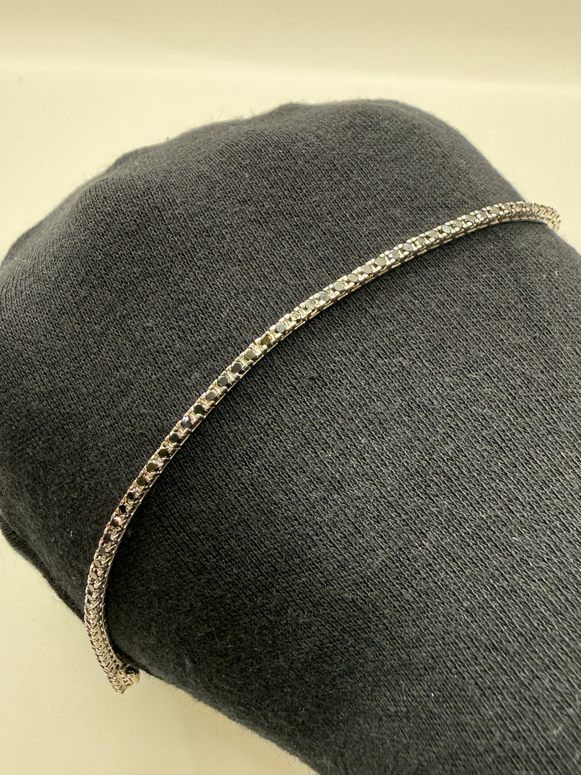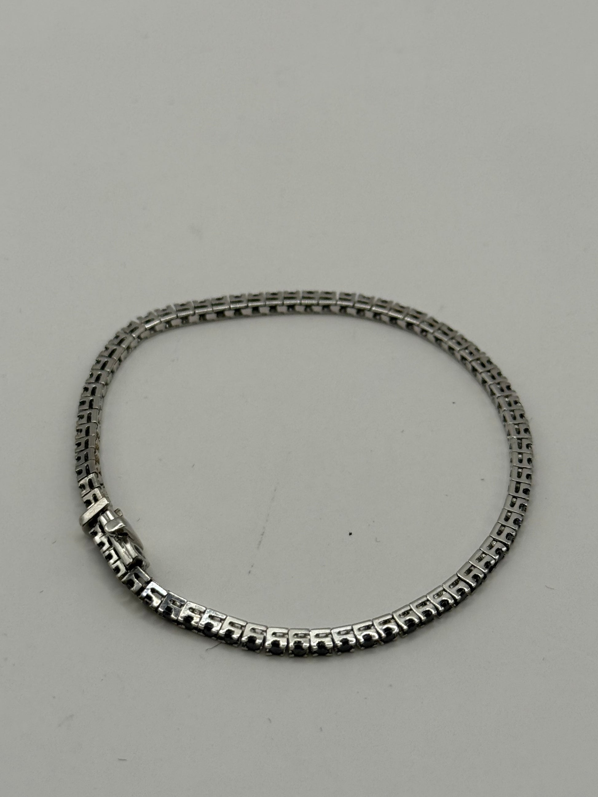 Ce bracelet en or blanc 18 carats présente une ligne continue de diamants sertis dans une monture souple et régulière, typique des bracelets rivière. Chaque pierre reflète la lumière avec finesse, créant un éclat discret mais raffiné qui contraste élégamment avec la brillance du métal. Léger et flexible, il épouse naturellement le poignet et offre une allure moderne, épurée et intemporelle. Une pièce élégante, idéale portée seule ou associée à d’autres bracelets.