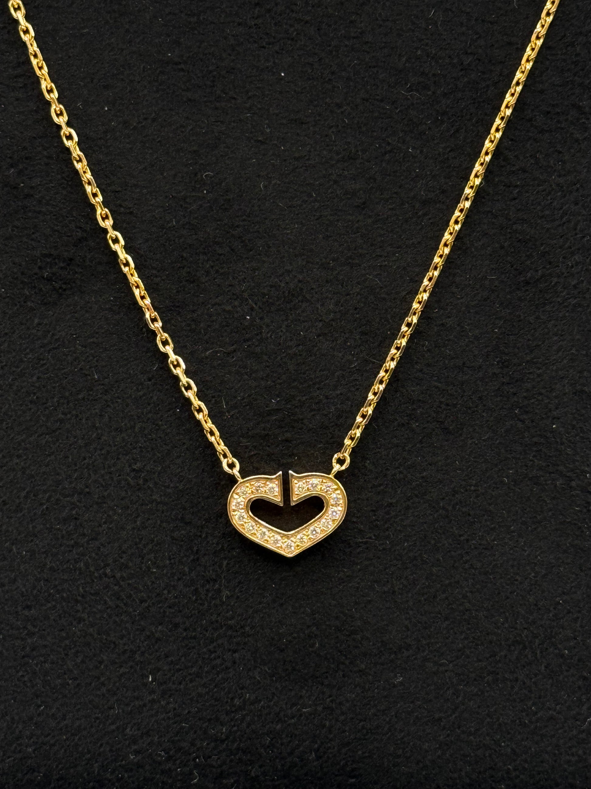 Ce collier signé Cartier appartient à la collection « Cœurs et Symboles », une ligne emblématique de la Maison mettant en avant des motifs raffinés et intemporels. Réalisé en or jaune, il présente un pendentif en forme de cœur stylisé, partiellement ouvert, souligné par un pavage de diamants qui apporte éclat et finesse à l’ensemble. La chaîne en or, élégante et discrète, met parfaitement en valeur ce motif lumineux typique de Cartier. Le bijou reflète à la fois la douceur du symbole et l’exigence joaillière de la Maison, en faisant une pièce délicate, précieuse et immédiatement reconnaissable.
