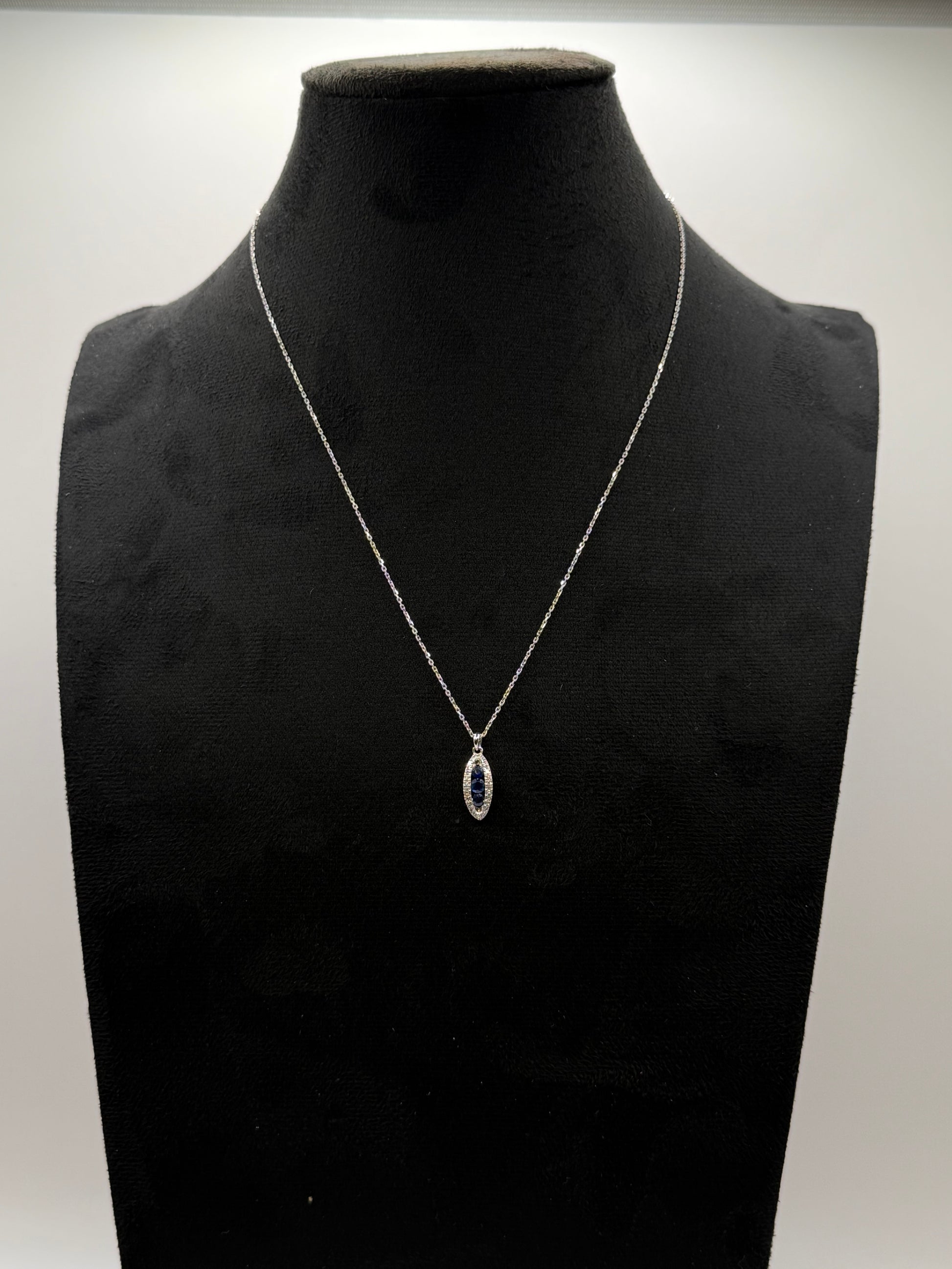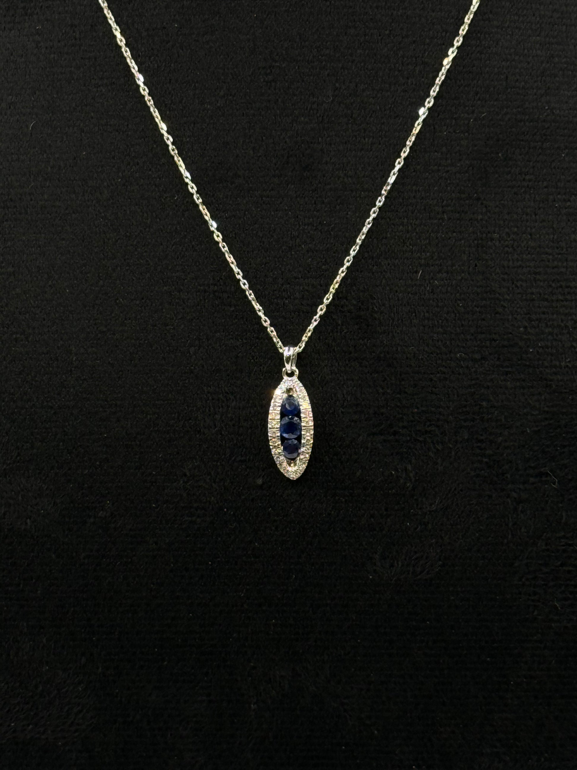 Ce collier en or blanc met en valeur un pendentif ovale délicatement orné de saphirs bleus profonds, entourés d’un halo de diamants étincelants. L’alliance du bleu intense et de la brillance du diamant crée un contraste élégant et harmonieux. Un bijou raffiné, symbole de distinction et de féminité intemporelle.