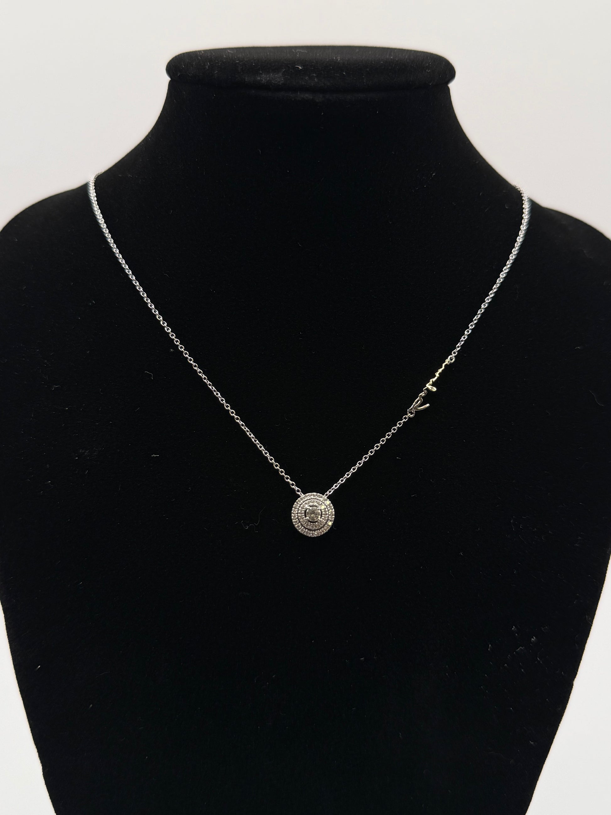 En vente VenduCe collier signé Salvini appartient à l’une des lignes emblématiques de la Maison italienne, reconnue pour son élégance contemporaine et son savoir-faire joaillier. Réalisé en or blanc, il présente un pendentif rond sublimé par un pavage de diamants finement sertis, formant un halo lumineux autour d’une pierre centrale mise en valeur par un serti précis et raffiné. La chaîne en or, discrète et harmonieuse, souligne parfaitement l’éclat de ce motif circulaire, typique de l’esthétique sobre et brillante de Salvini.