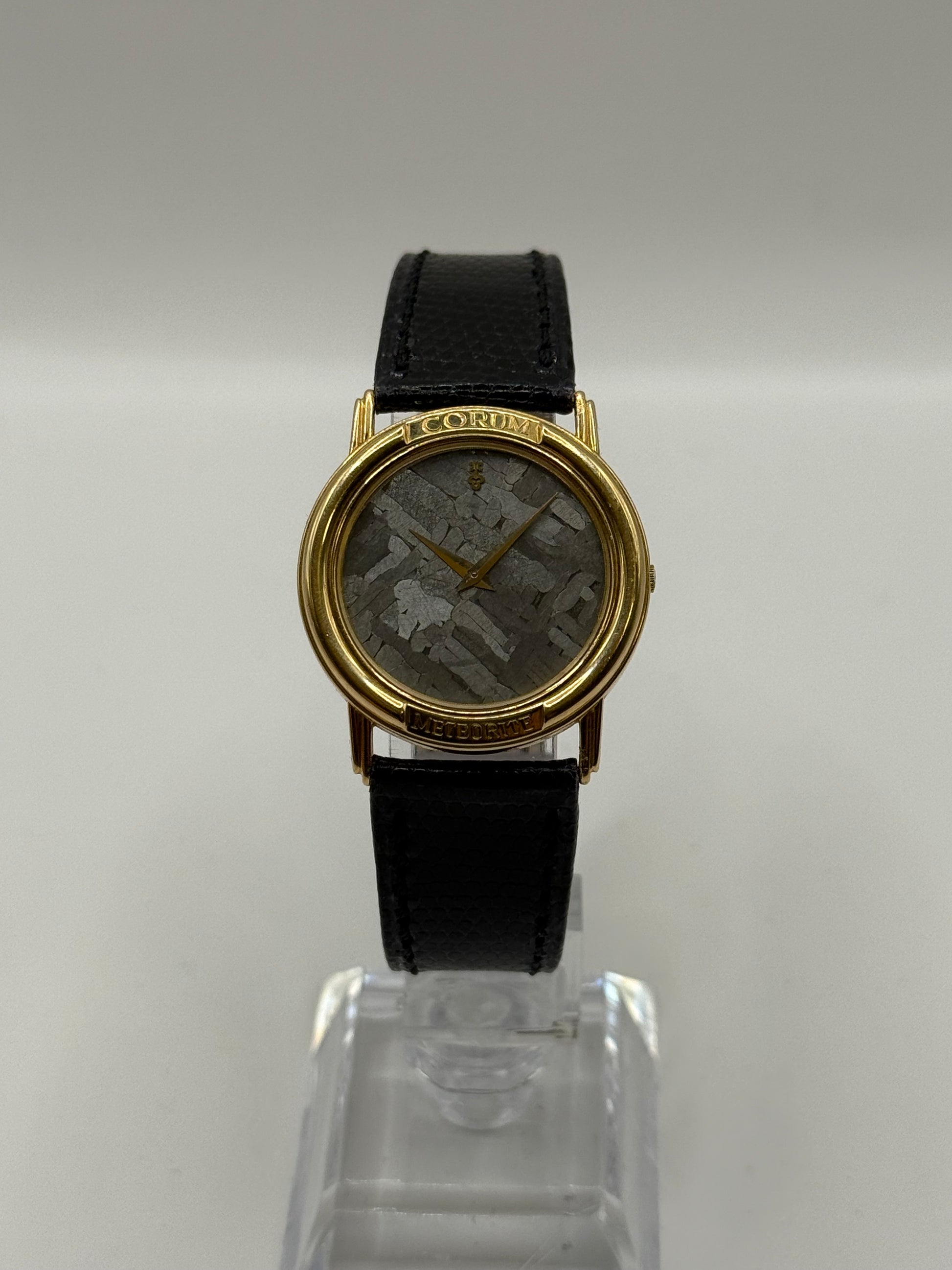 Cette Corum combine l’élégance de l’or jaune 18k avec un cadran exceptionnel taillé dans une véritable météorite. Chaque motif est unique et donne à la montre une présence fascinante, presque sculpturale, qui attire immédiatement le regard. Le fond gravé mentionnant l’origine cosmique du fragment et son point d’impact au Mexique renforce encore le caractère singulier de cette pièce. Les aiguilles dorées complètent harmonieusement l’ensemble, animées par un mouvement à quartz précis. Montée sur un bracelet en cuir noir, elle offre une allure raffinée et originale à la fois.