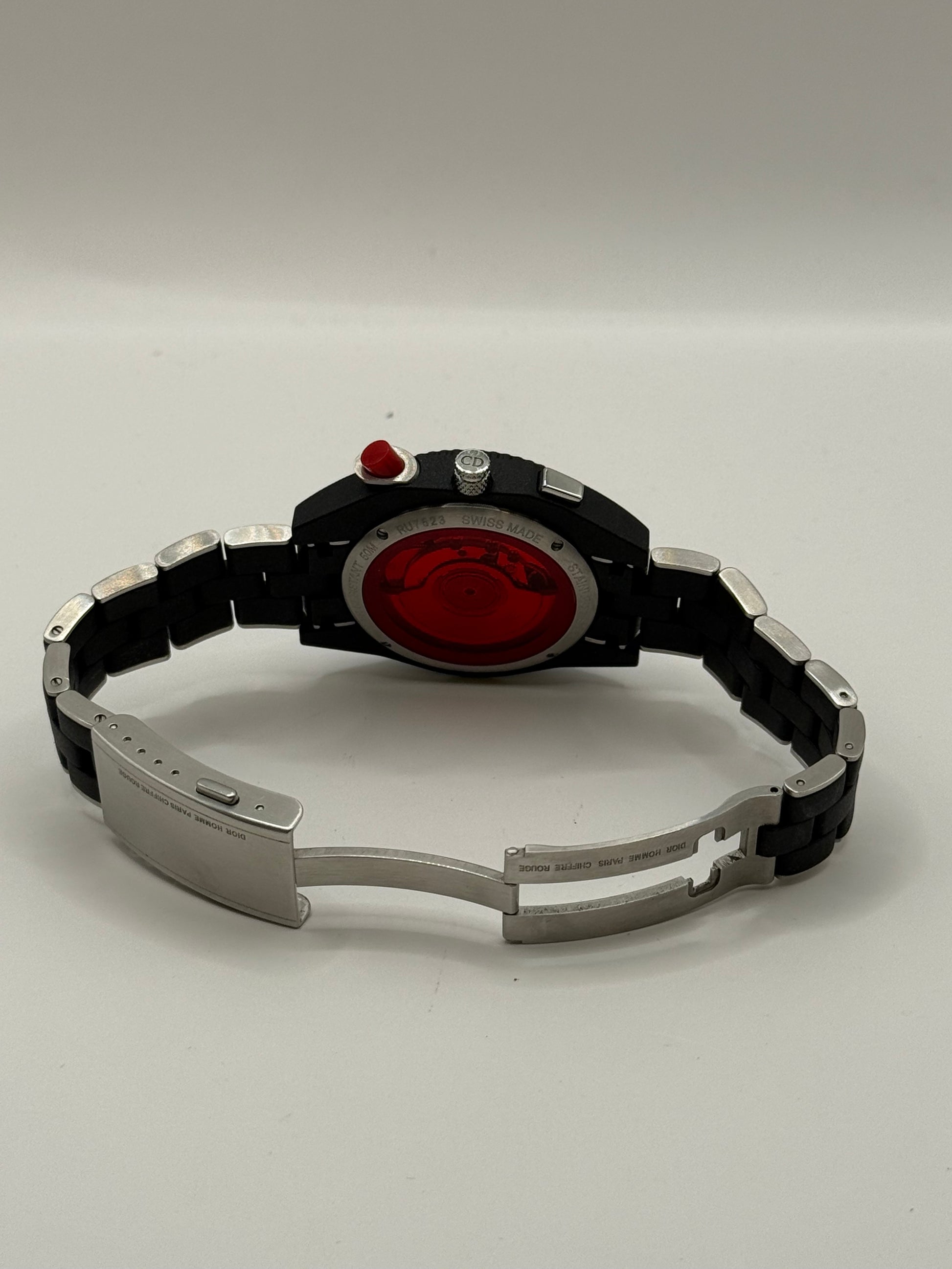 Ce Dior Chiffre Rouge A05 réunit le style avant-gardiste de la maison Dior et la rigueur horlogère suisse. Son boîtier de 41 mm en acier surmoulé de caoutchouc noir lui donne une présence sportive et moderne, renforcée par le poussoir rouge signature placé à deux heures. Le cadran noir offre un contraste élégant avec ses trois compteurs argentés azurés et son affichage de la date à quatre heures, tandis que l’échelle tachymétrique souligne le caractère technique du modèle.