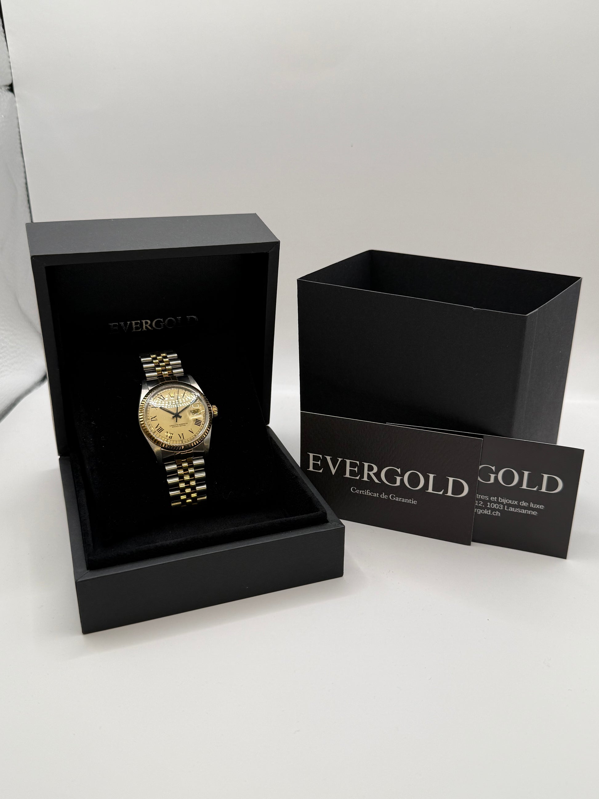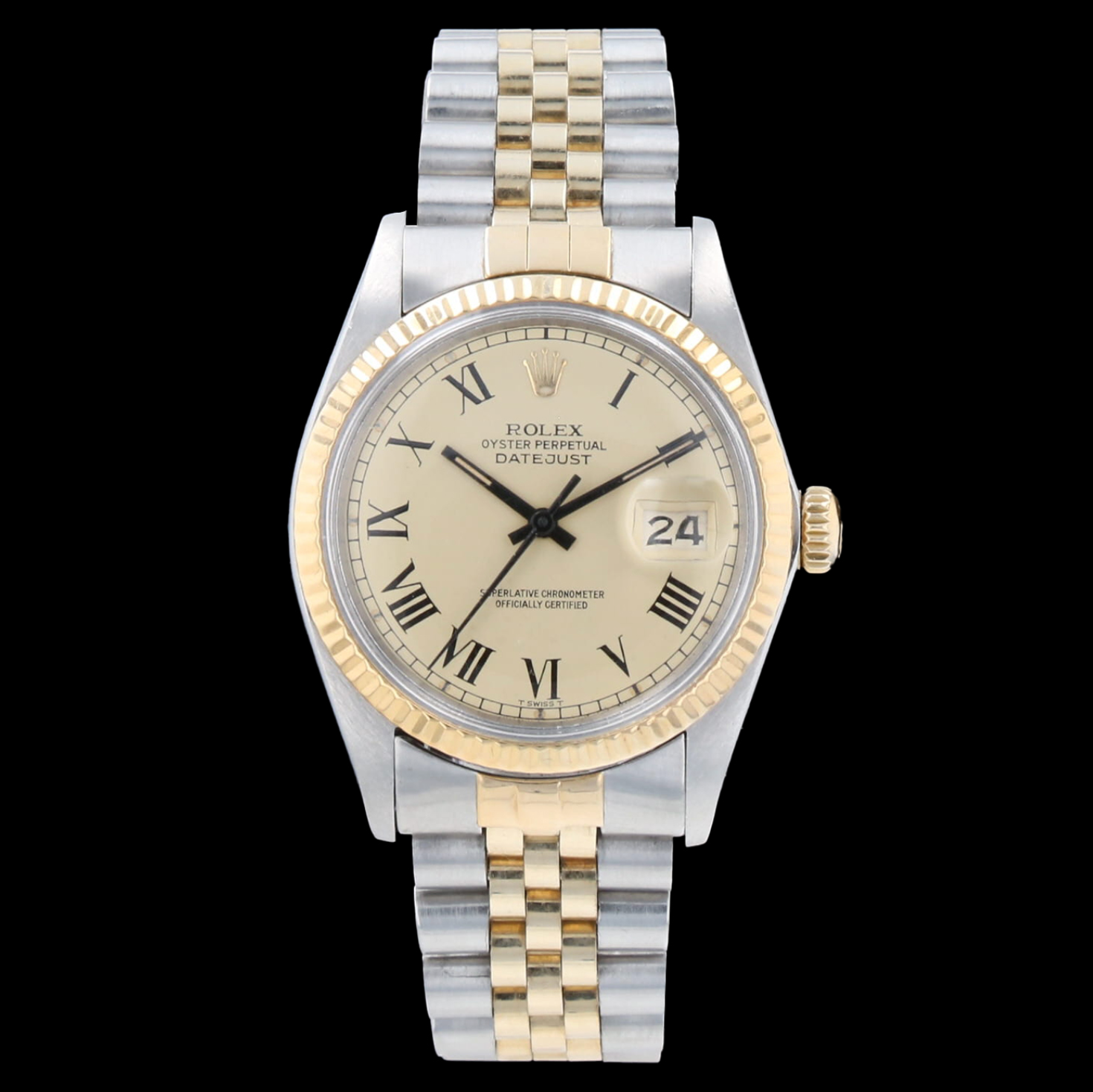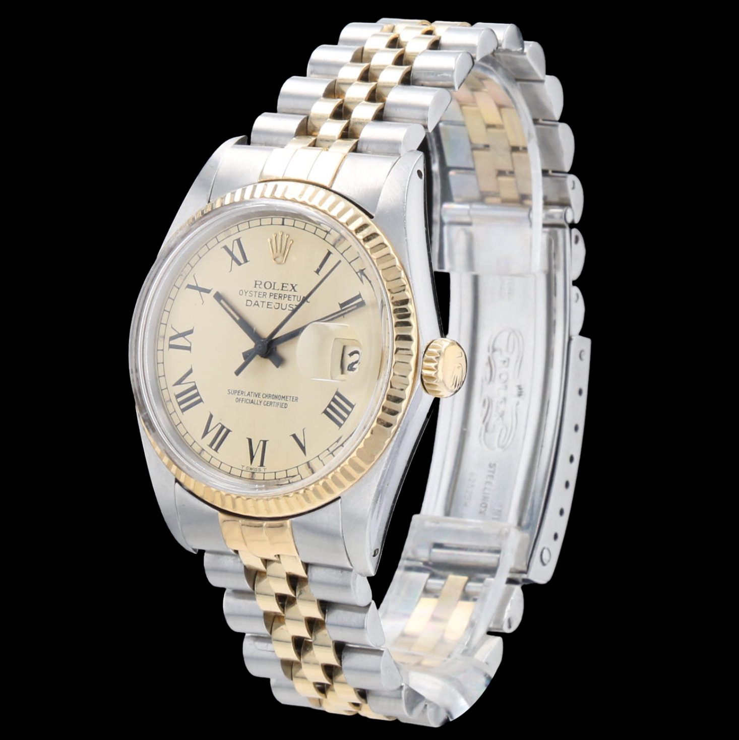 Le cadran champagne arbore des chiffres romains noirs ainsi que des aiguilles luminescentes assorties. La date est visible à 3 heures, protégée par un verre plexiglas – cette référence étant la dernière des Datejust à en être équipée avant l’introduction du verre saphir sur les modèles 16233. Fond vissé en acier.