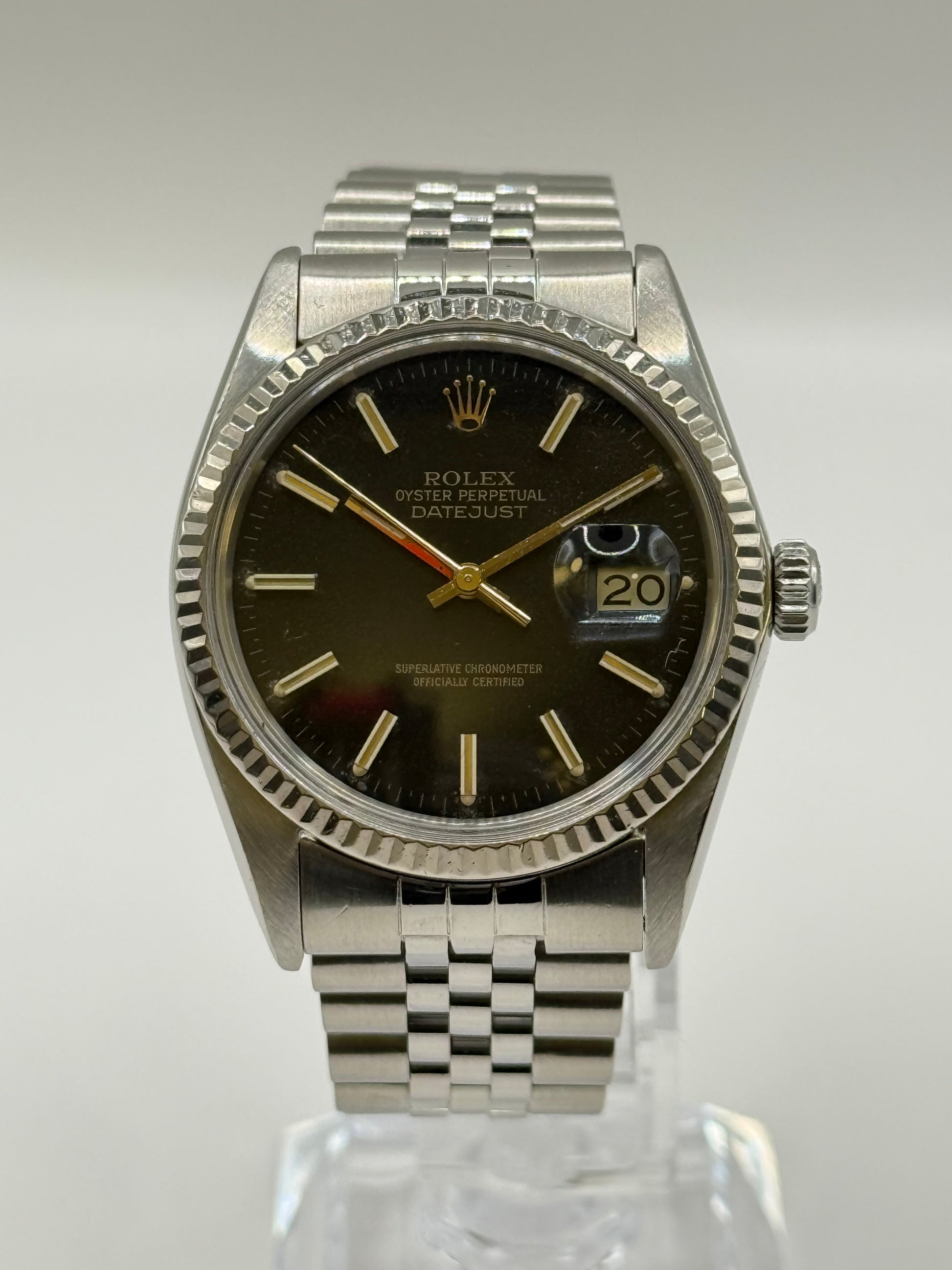 Montre mécanique à remontage automatique. Boîtier en acier de 36 mm de diamètre avec lunette cannelée en or blanc 750/18 carats, bracelet jubilé en acier et boucle déployante Rolex. Cadran noir avec guichet de date à trois heures, verre en plexiglas et fond vissé en acier Rolex.