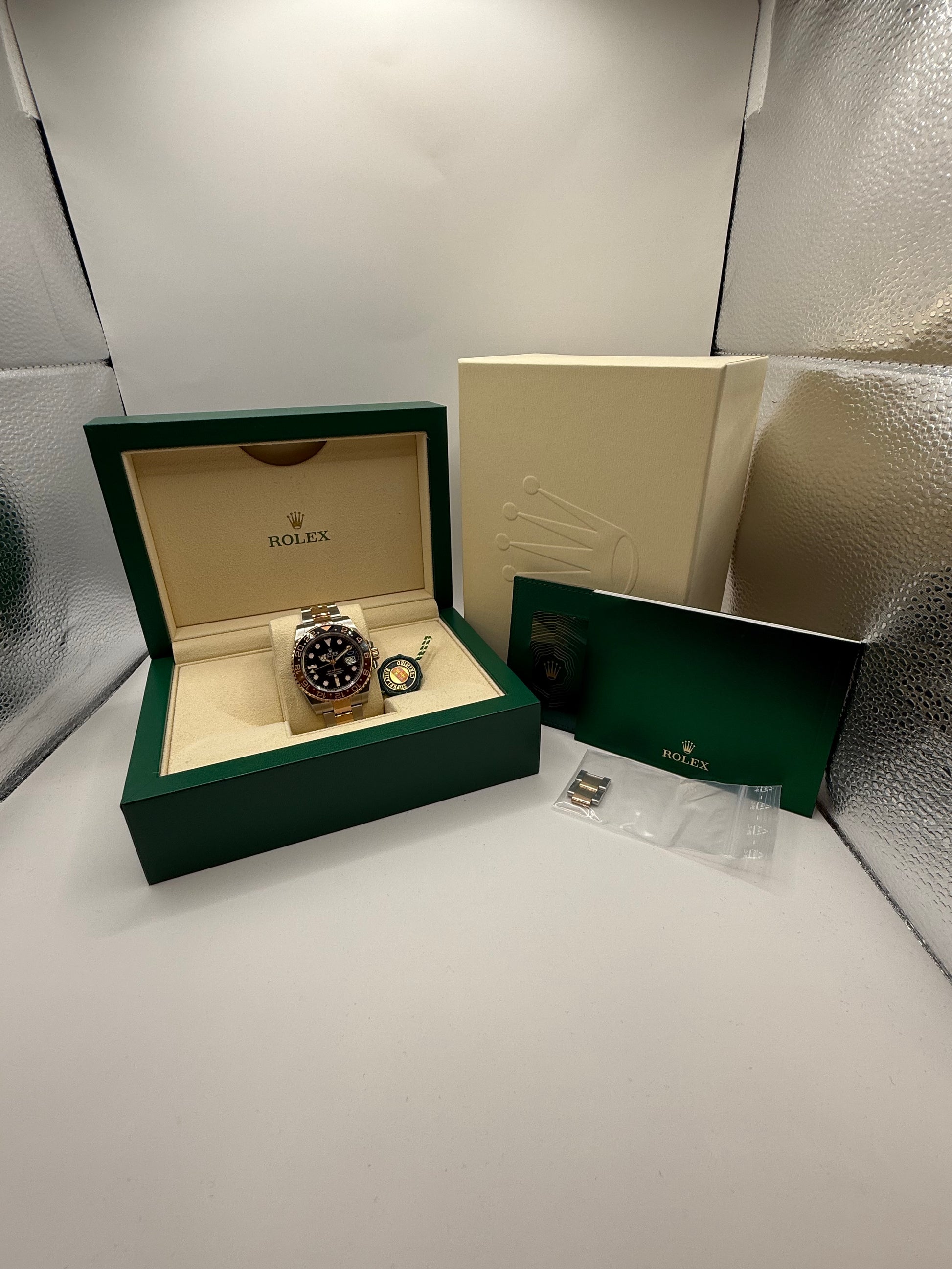 Cette Rolex GMT-Master II, surnommée “Root Beer”, présente une combinaison élégante d’acier Oystersteel et d’or Everose 18 ct. Sa lunette Cerachrom bicolore noire et marron, exclusive à cette référence, offre un contraste raffiné et un look immédiatement reconnaissable parmi les modèles GMT.