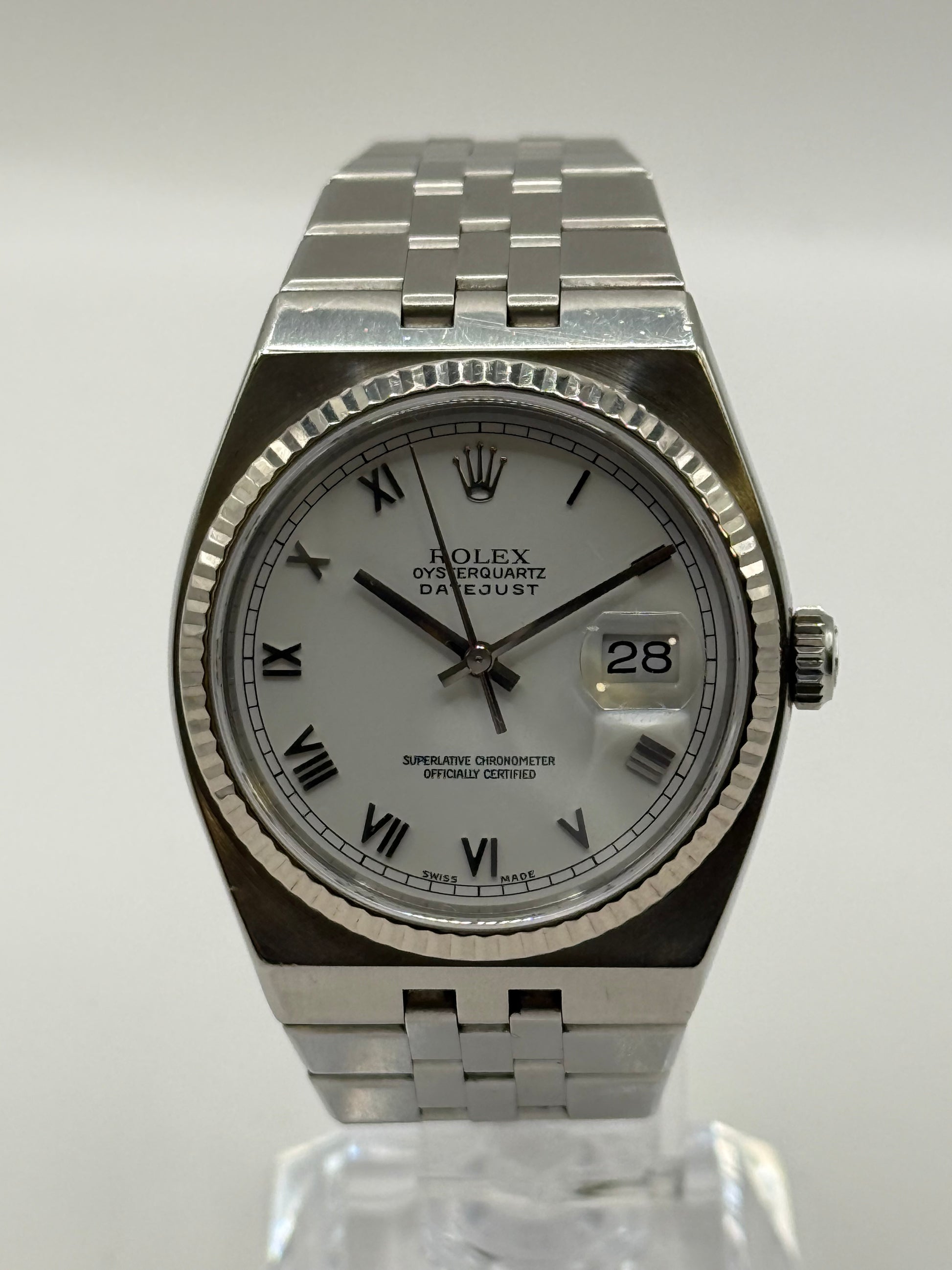 Élégante et singulière, cette Rolex Oysterquartz Datejust de 2003 séduit par son design anguleux et sa précision exceptionnelle. Son boîtier en acier de 36 mm au fini satiné et sa lunette cannelée reflètent parfaitement le style distinctif de la ligne Oysterquartz. Le cadran blanc, rehaussé d’index romains noirs et du guichet date à 3 heures avec loupe cyclope, offre une lisibilité impeccable et une allure intemporelle.