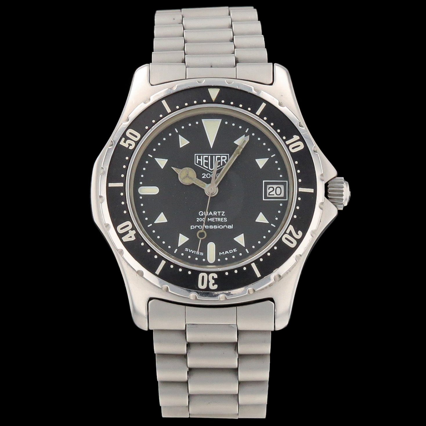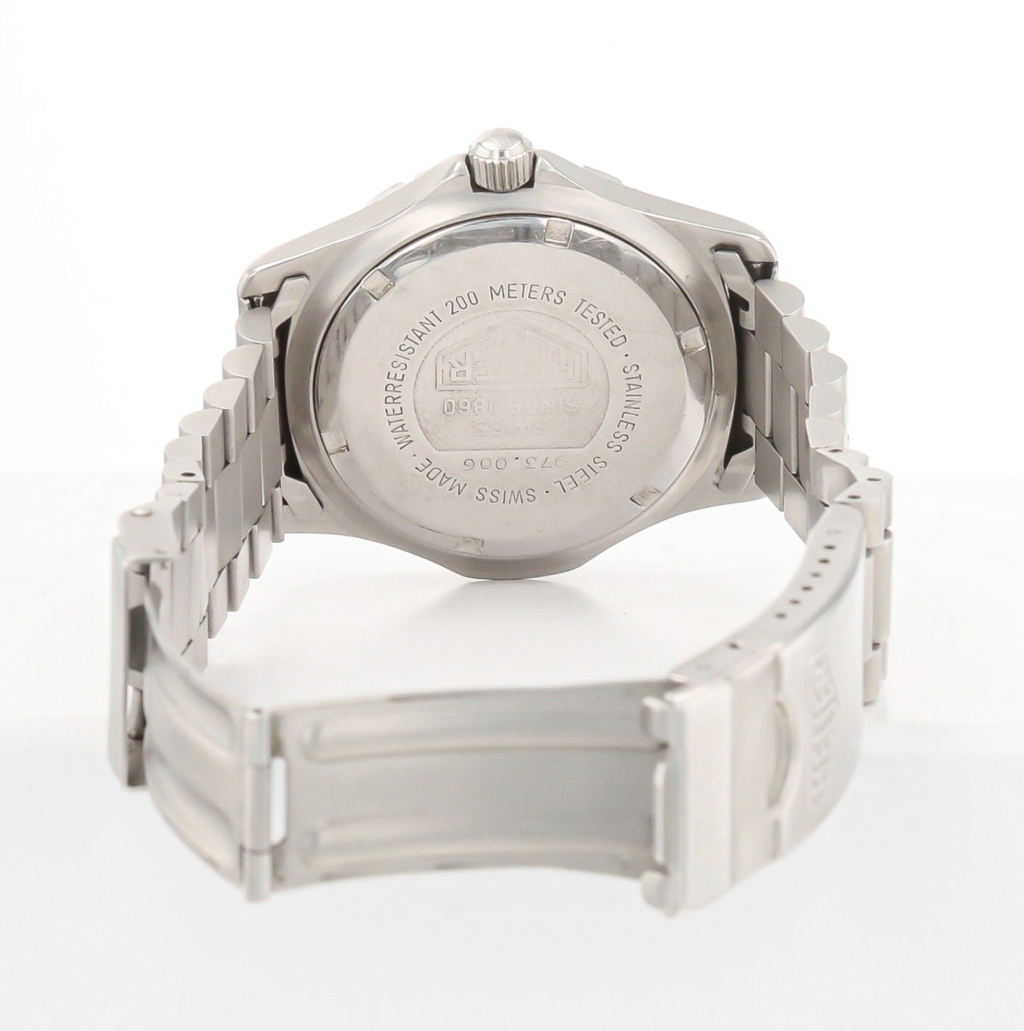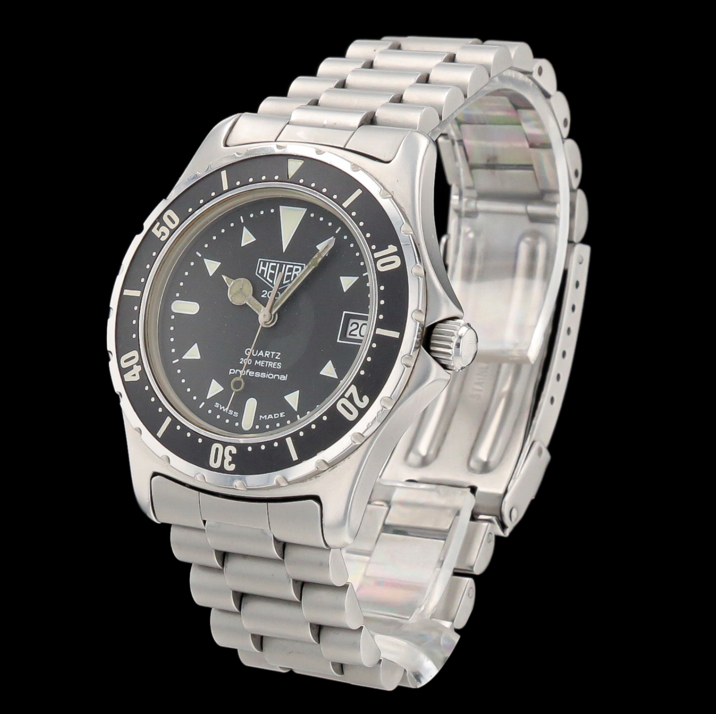 Montre à mouvement Quartz. Boitier en acier de 38 mm de diamètre avec lunette tournante noire et bracelet en acier. Boucle double déployante en acier Tag Heuer. Cadran noir avec date panorama à 3h. Index et aiguilles luminescents.