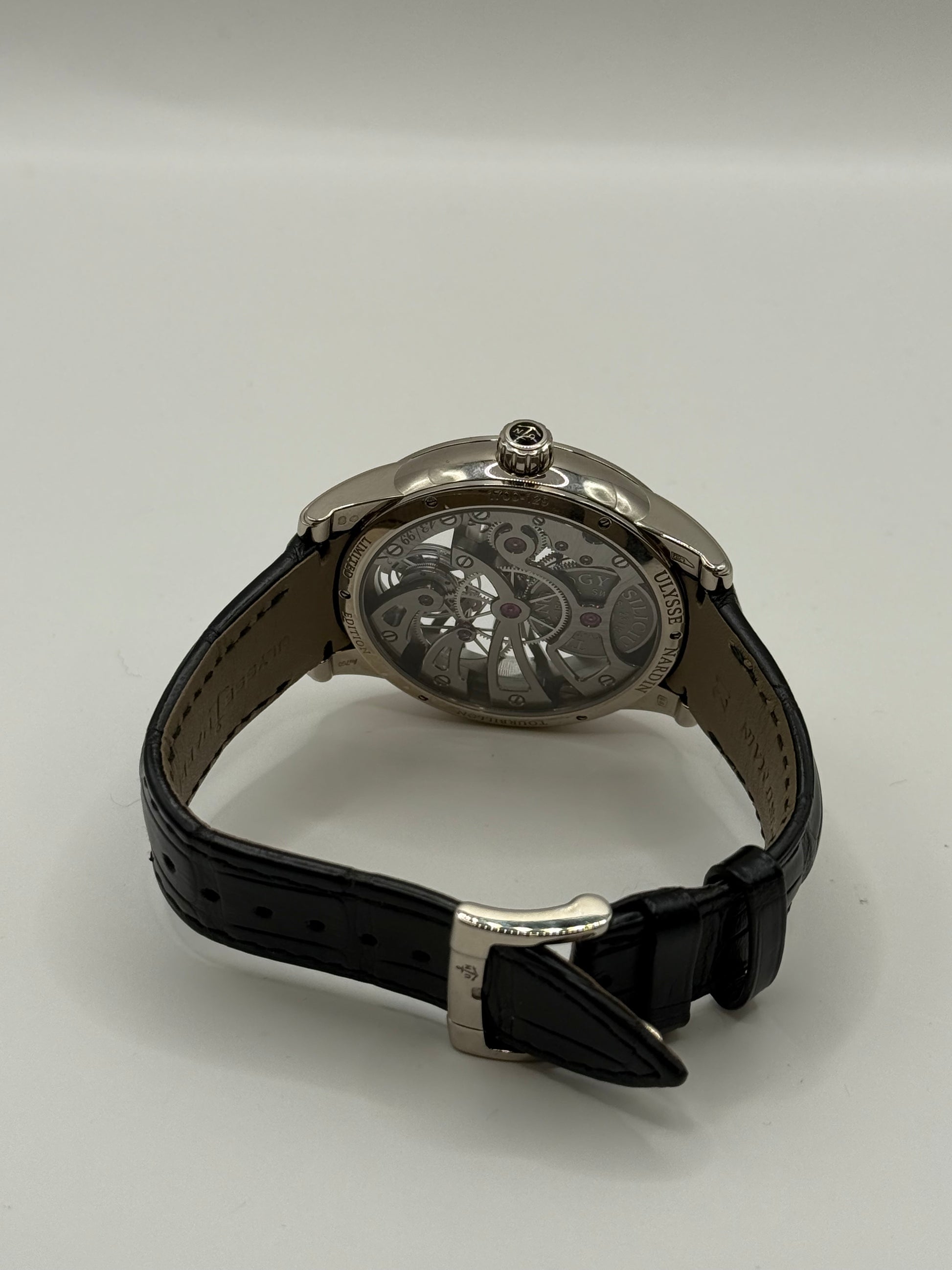 En vente VenduPièce d’exception au caractère résolument horloger, cette Ulysse Nardin réf. 1700-129 illustre avec brio la maîtrise de la haute complication suisse. Produite en édition limitée à seulement 99 exemplaires, celle-ci porte le numéro 13, renforçant son exclusivité et son attrait pour les collectionneurs avertis. Son boîtier en or blanc est sublimé par un sertissage de diamants finement exécuté sur la lunette et les cornes, apportant éclat et raffinement sans compromettre l’équilibre esthétique. Le cadran entièrement squeletté révèle une architecture mécanique spectaculaire, laissant admirer chaque détail du mouvement, jusqu’au tourbillon majestueux à 6 heures, véritable cœur battant de la montre. Les aiguilles bleuies contrastent élégamment avec la transparence du cadran, tandis que le bracelet en cuir noir finition alligator parachève l’ensemble avec sobriété et élégance. Une montre rare, alliant technicité, joaillerie et exclusivité, destinée aux amateurs de grandes complications et de pièces horlogères hors normes. Venez l’essayer dans le magasin Evergold, à la rue Saint-François 12 à Lausanne.