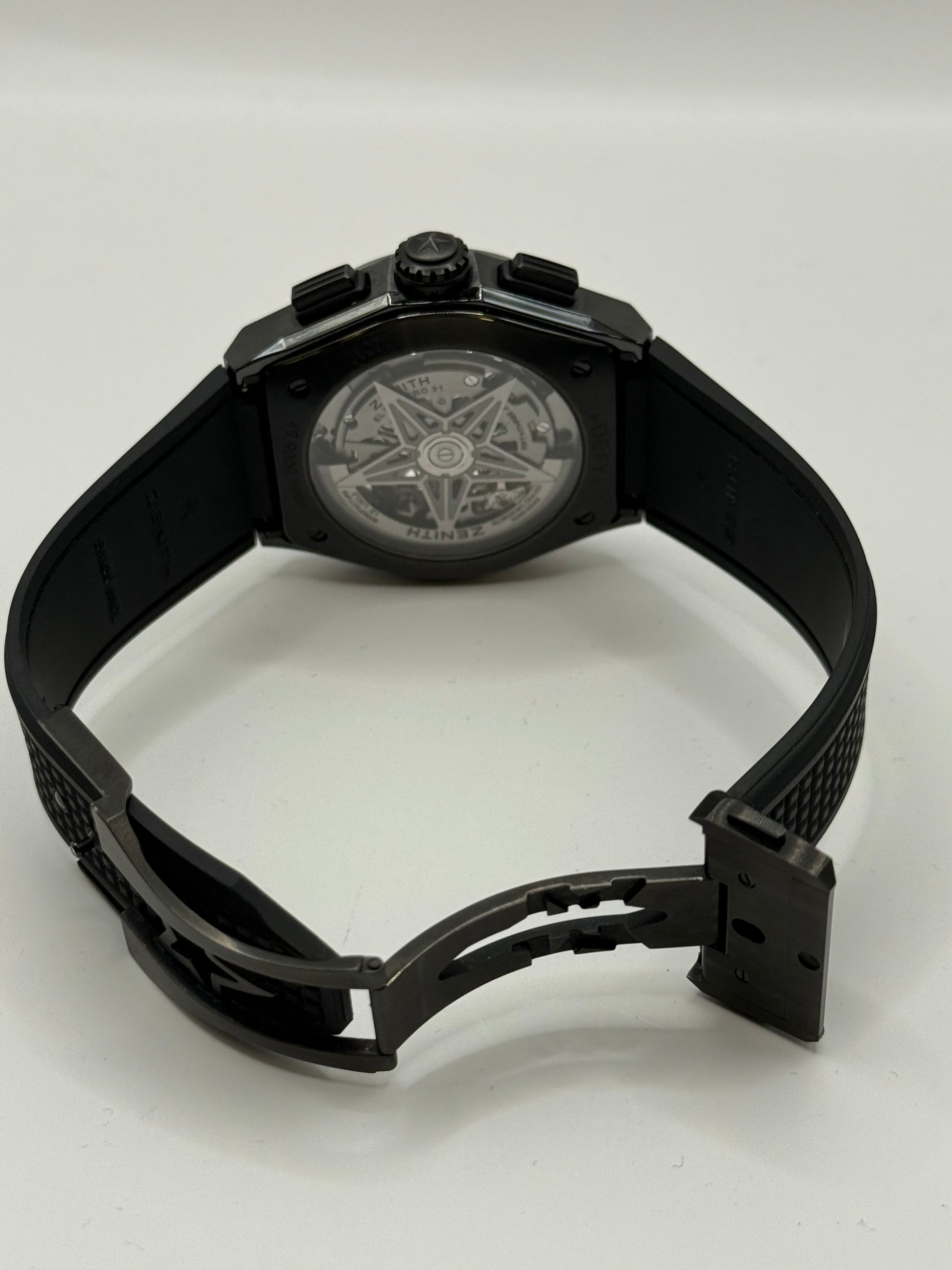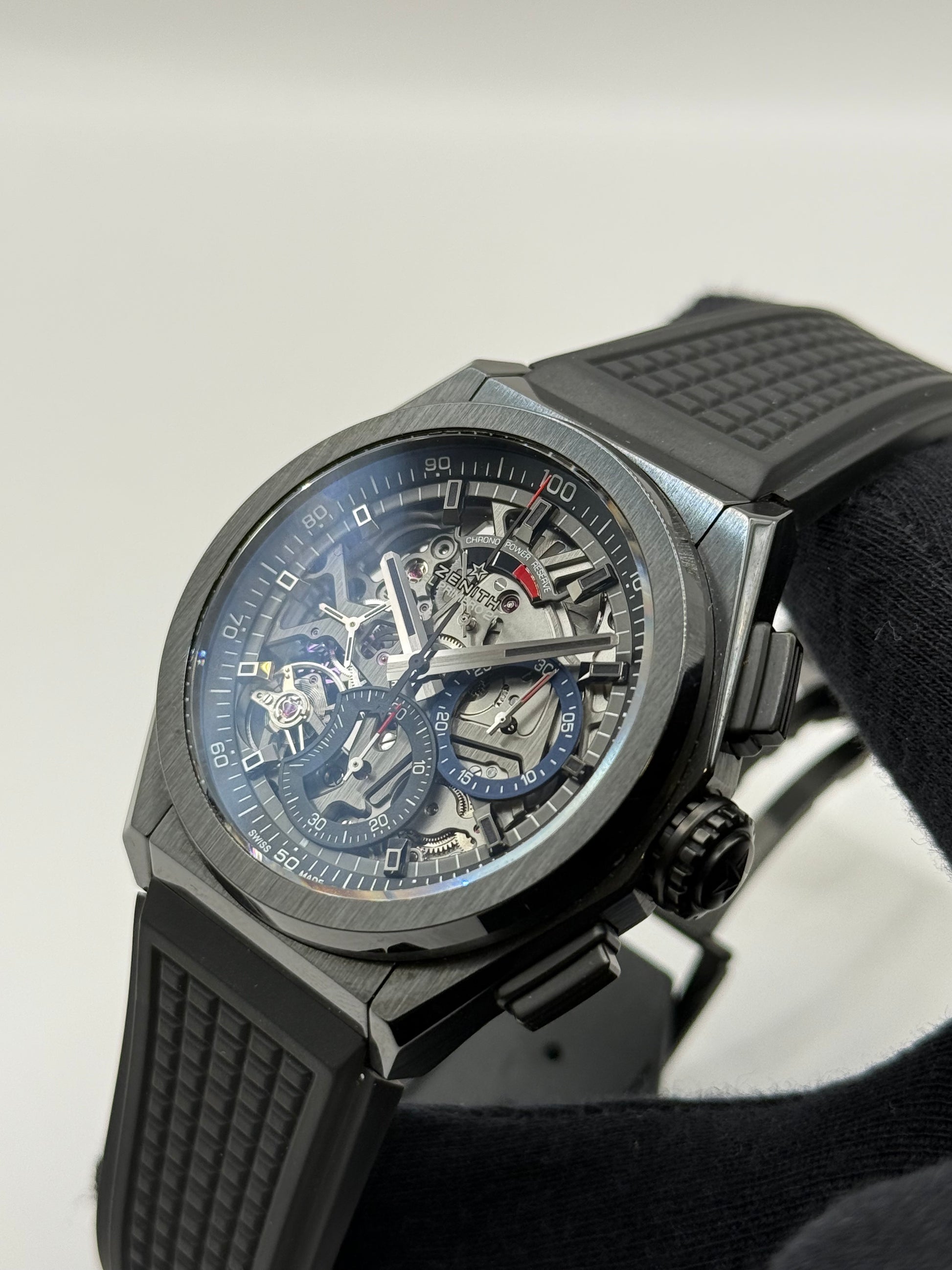 Zenith Defy El Primero 21 réf. 49.9000.9004 en céramique noire. Ce modèle se distingue par son boîtier de 44 mm au design contemporain et son cadran squelette révélant le calibre automatique El Primero 9004. Dotée d’un double échappement permettant la mesure au 1/100e de seconde, elle offre une lecture dynamique du chronographe avec l’aiguille centrale effectuant un tour par seconde. Le travail ajouré met en valeur les ponts métallisés, les sous-compteurs et le barillet dédié au chronographe, tandis que le bracelet en caoutchouc noir assure confort et style sportif. Étanche à 100 mètres, elle combine technicité moderne et identité forte propre à la collection Defy.